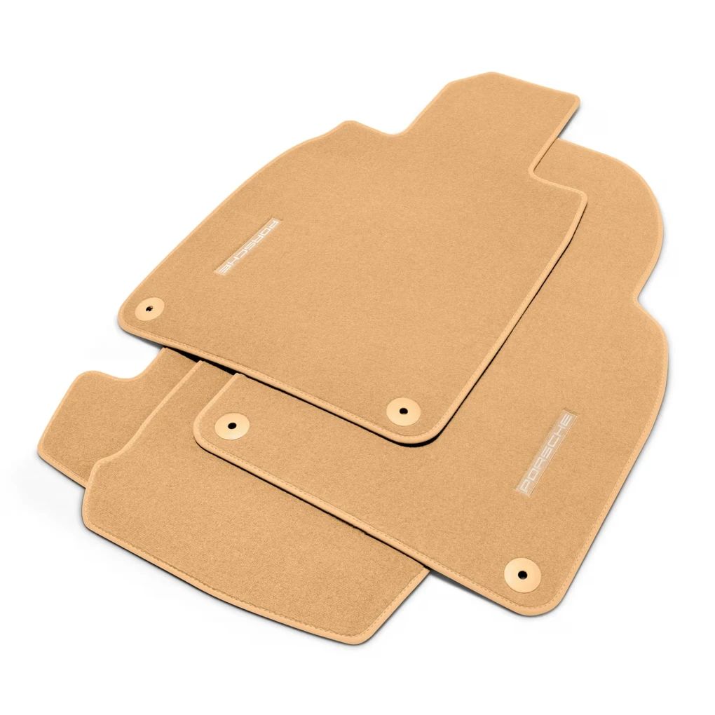 Vierteiliger Satz Fußmatten in luxorbeige mit Einfassung aus hochwertigem Nubukleder und Einleger mit eingesticktem, silbernen „PORSCHE“ Schriftzug.