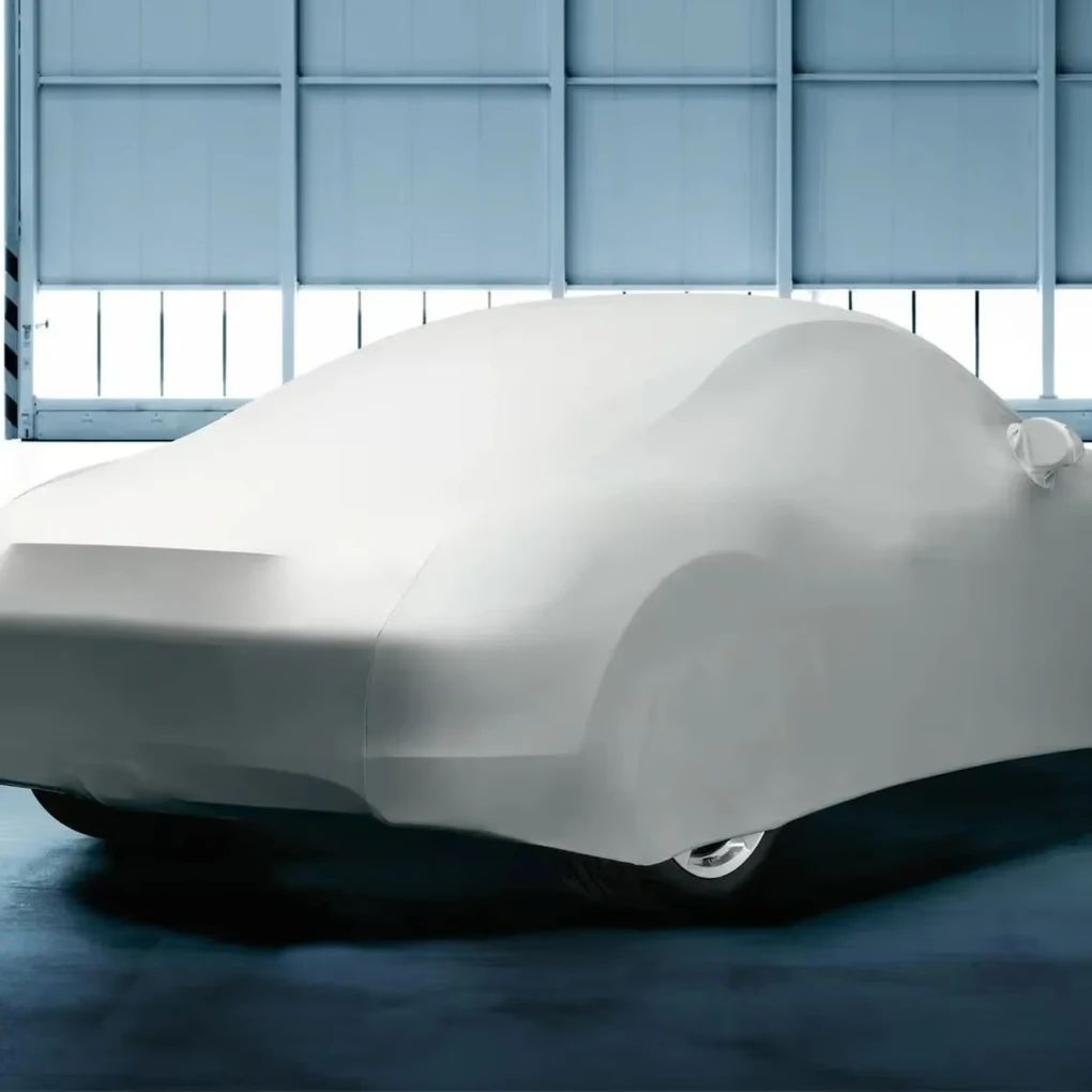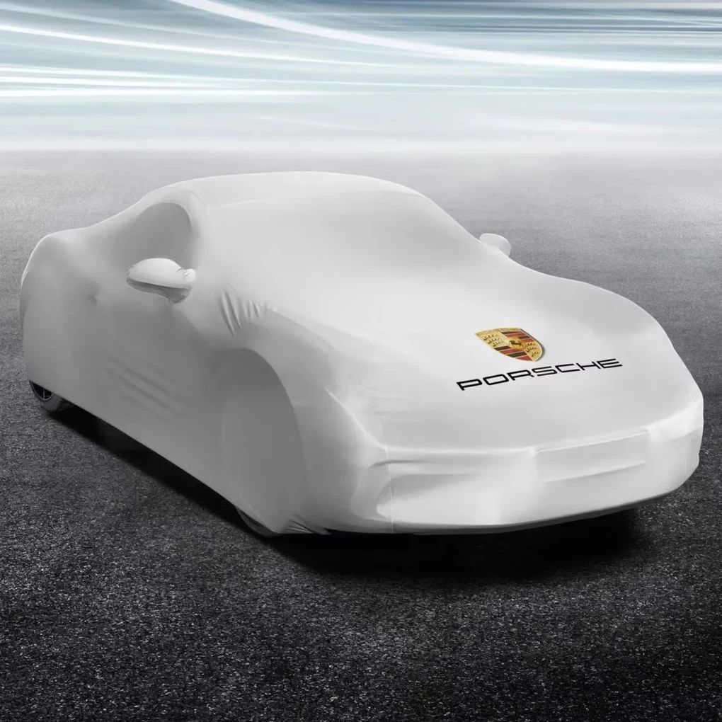 Passgenaue Indoor-Fahrzeugabdeckung aus atmungsaktivem, antistatischem und schmutzabweisendem Material. Mit farbigem Porsche Wappen und „PORSCHE“ Schriftzug.