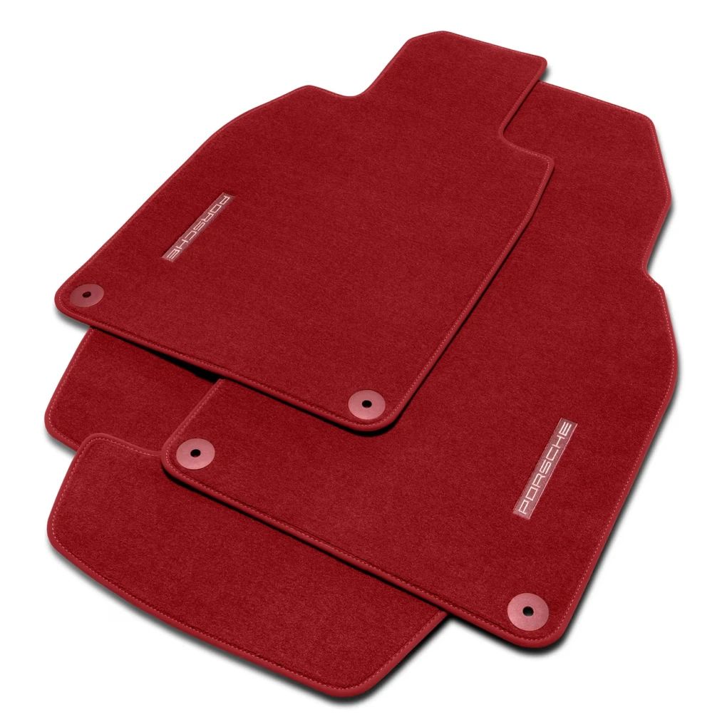 Vierteiliger Satz Fußmatten in sattelbraun mit Einfassung aus hochwertigem Nubukleder und Einleger mit eingesticktem, silbernen „PORSCHE“ Schriftzug.