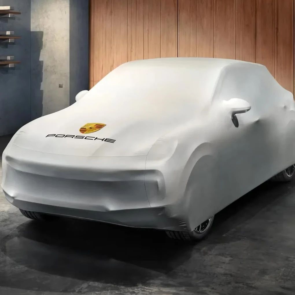 Passgenaue Indoor-Fahrzeugabdeckung aus atmungsaktivem, antistatischem und schmutzabweisendem Material. Mit farbigem Porsche Wappen und „PORSCHE“ Schriftzug.