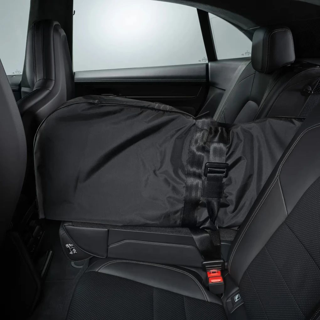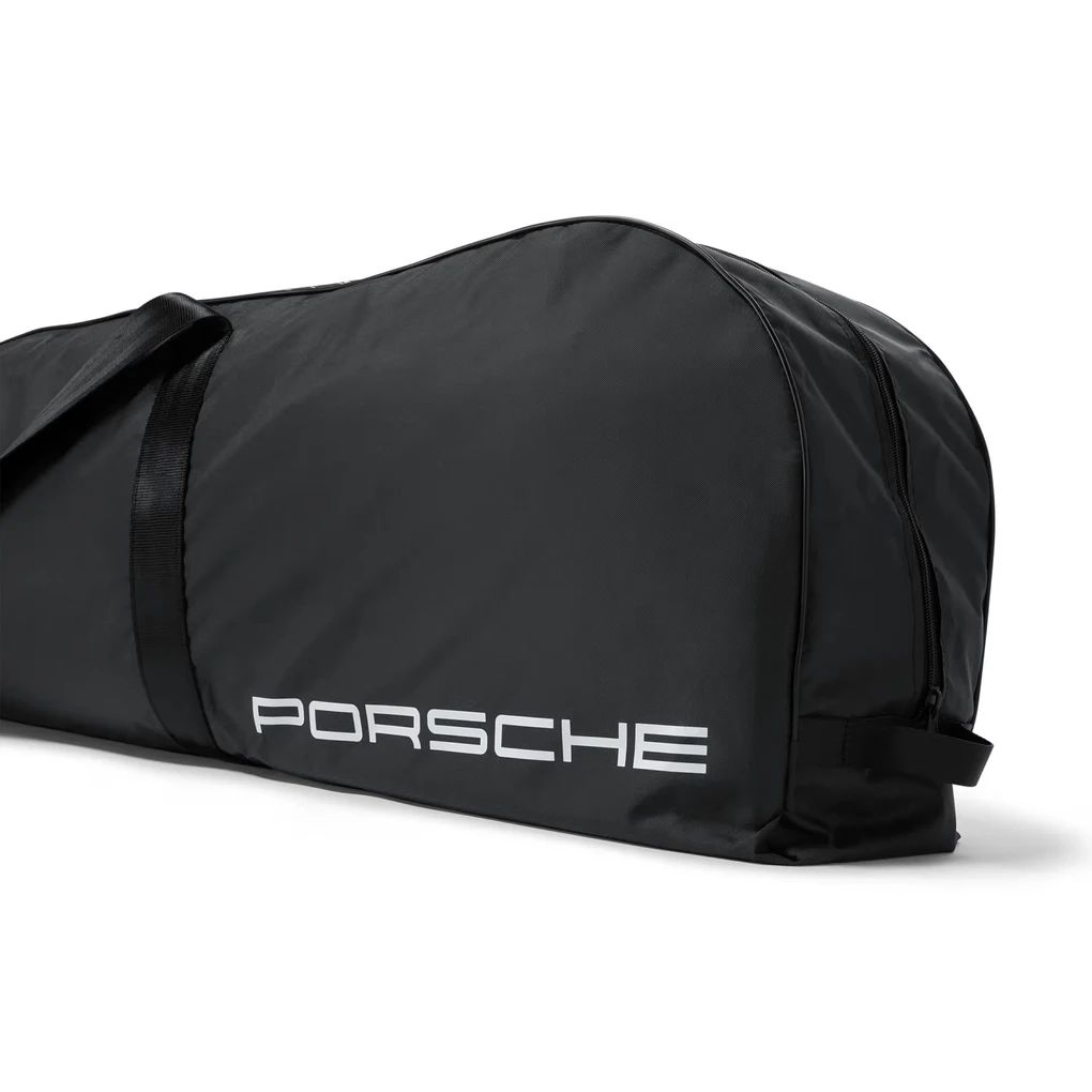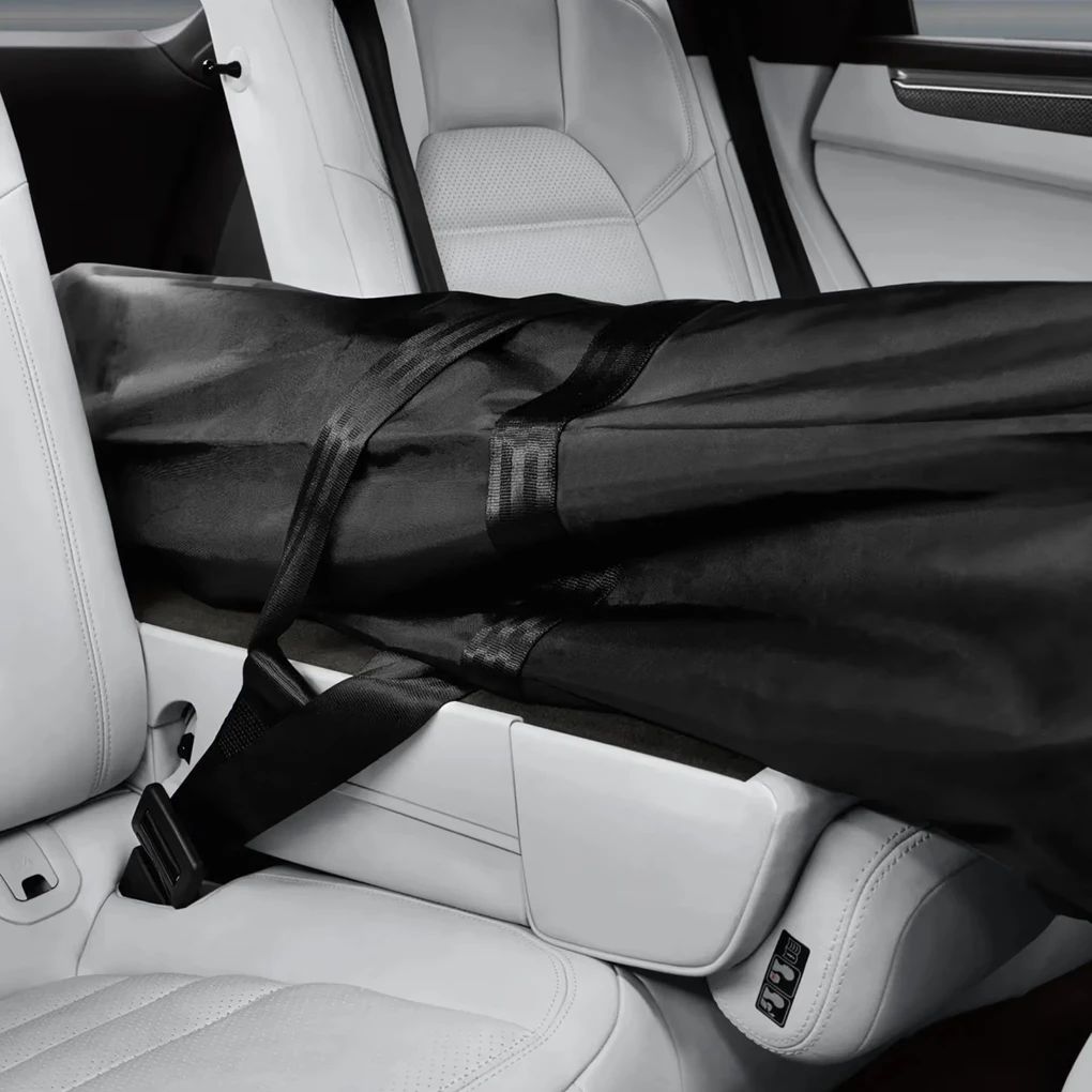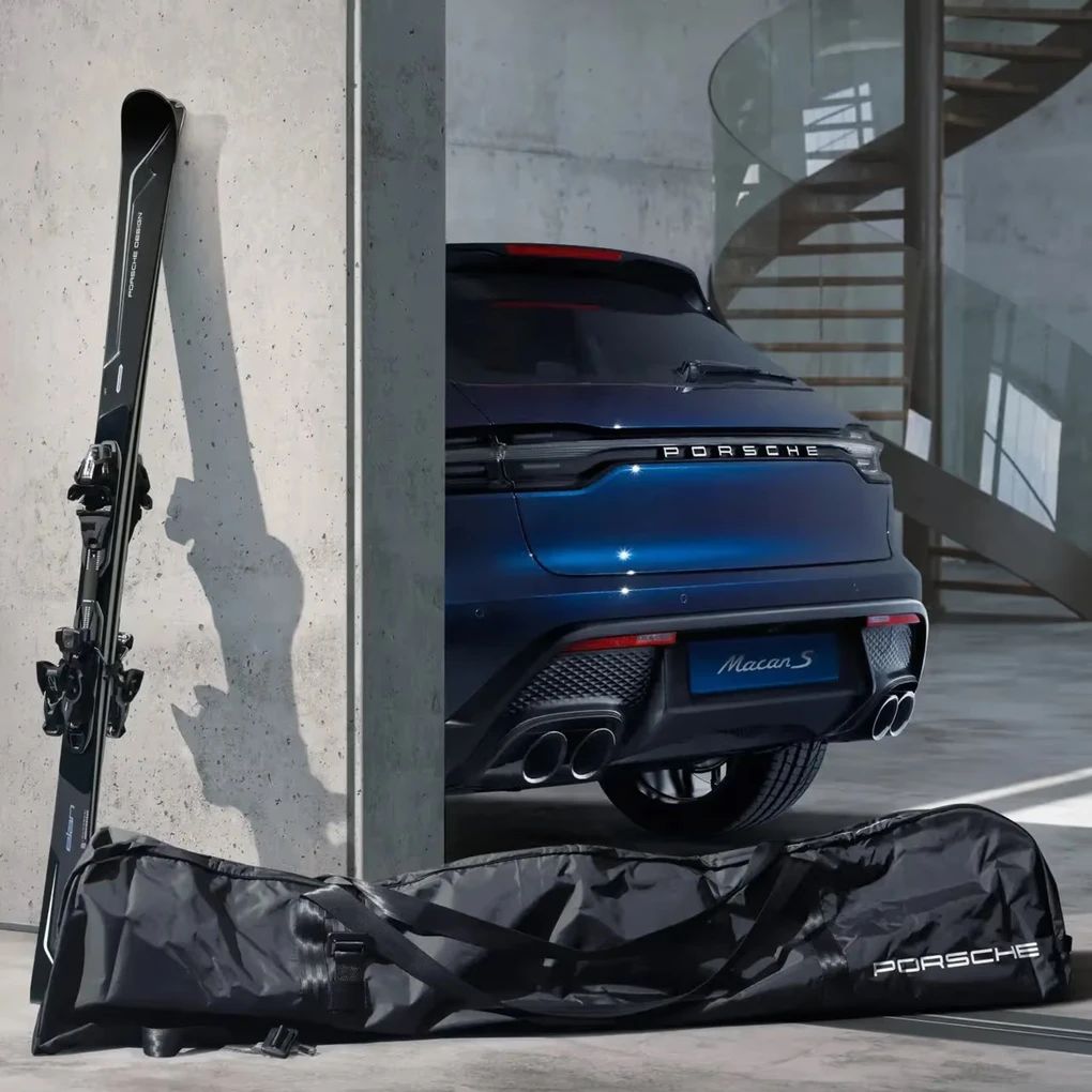 Der Skisack wurde von Porsche Tequipment fahrzeugspezifisch entwickelt und auf Crashsicherheit getestet. Durch die Gurtanbindung können Skier und Snowboards damit sicher transportiert werden.