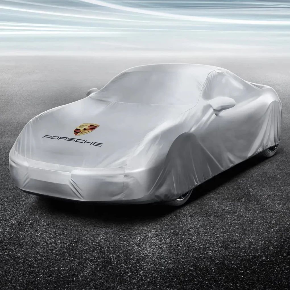 Passgenaue Outdoor-Fahrzeugabdeckung aus wasserabweisendem Material mit farbigem Porsche Wappen und „PORSCHE“ Schriftzug. Inklusive Diebstahlsicherung.