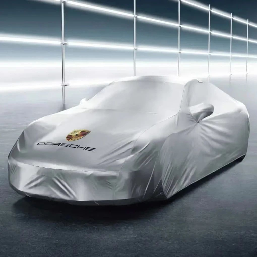 Passgenaue Outdoor-Fahrzeugabdeckung aus wasserabweisendem Material mit farbigem Porsche Wappen und „PORSCHE“ Schriftzug. Inklusive Diebstahlsicherung.