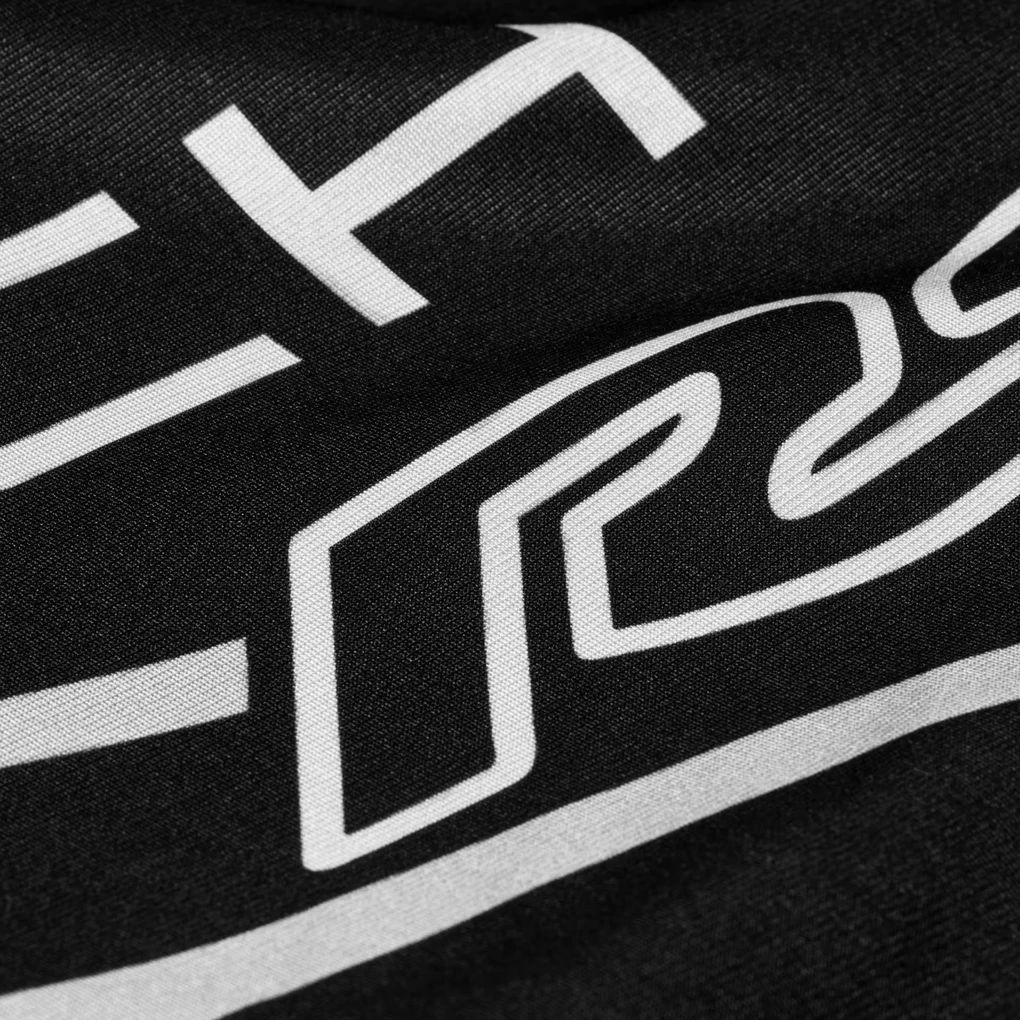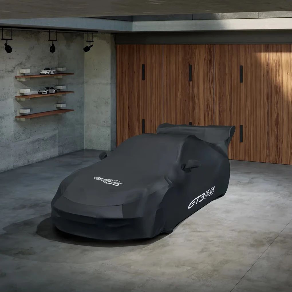 Passgenaue schwarze Indoor-Fahrzeugabdeckung aus atmungsaktivem, antistatischem und schmutzabweisendem Material. In 911 GT3 RS Design mit Keder in Eisgrau, Logo „Weissach-Paket“ in Weiß-Eisgrau auf der Fronthaube sowie seitlichem Modellschriftzug in Weiß.
