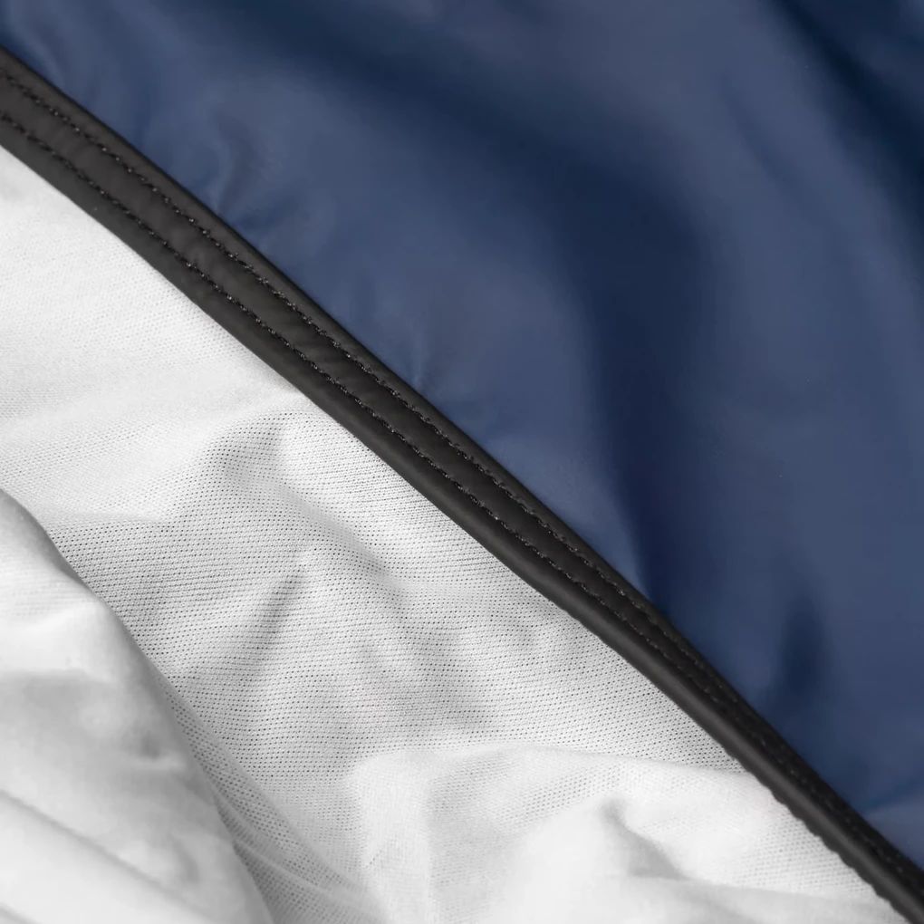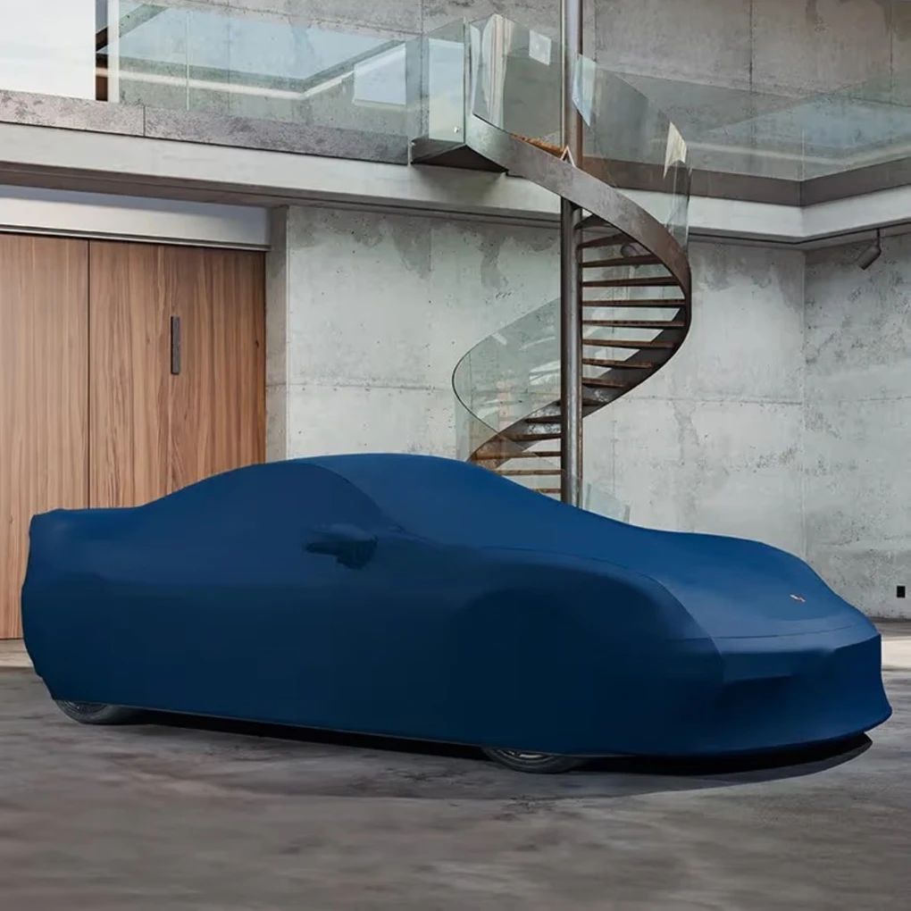 Passgenaue blaue Outdoor-Fahrzeugabdeckung mit farbigem Porsche Wappen.