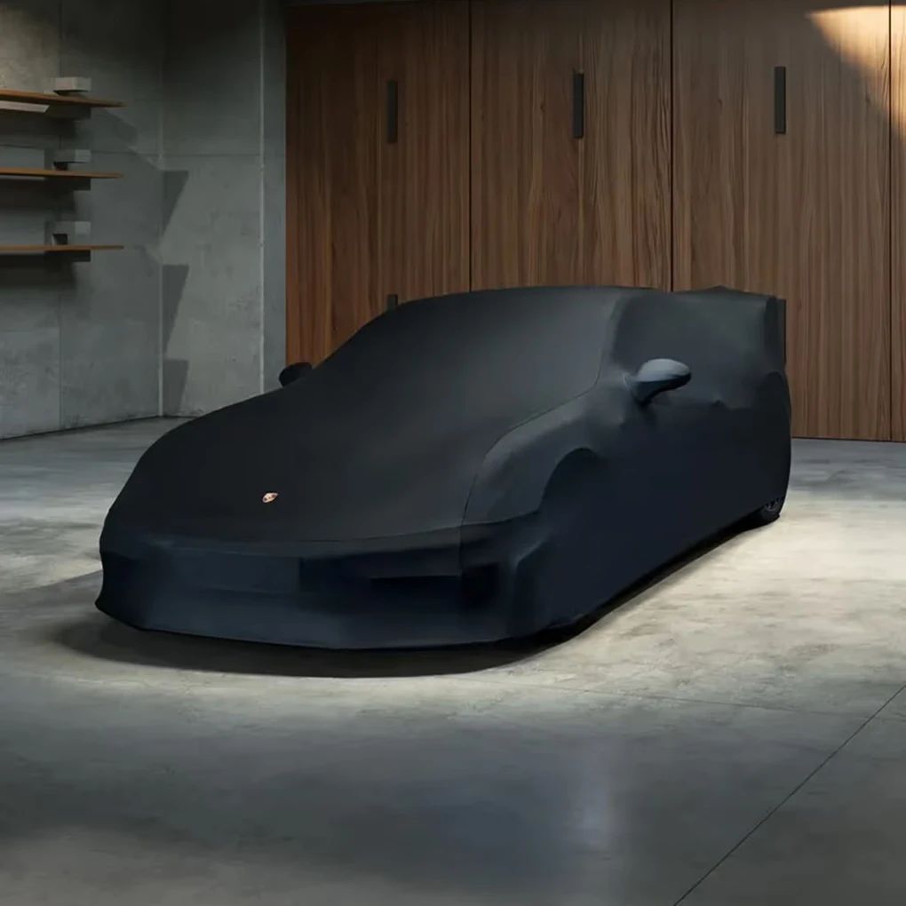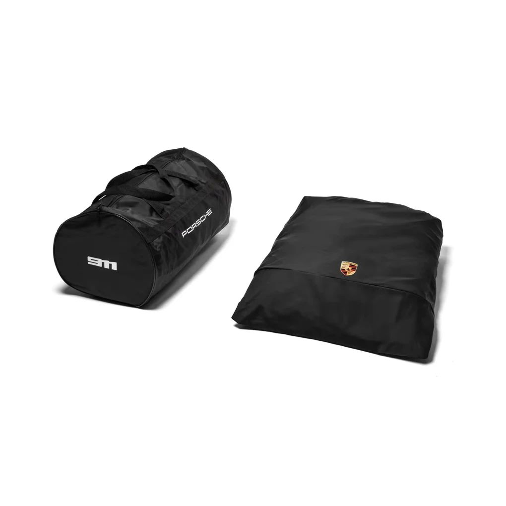 Passgenaue schwarze Outdoor-Fahrzeugabdeckung mit farbigem Porsche Wappen.
