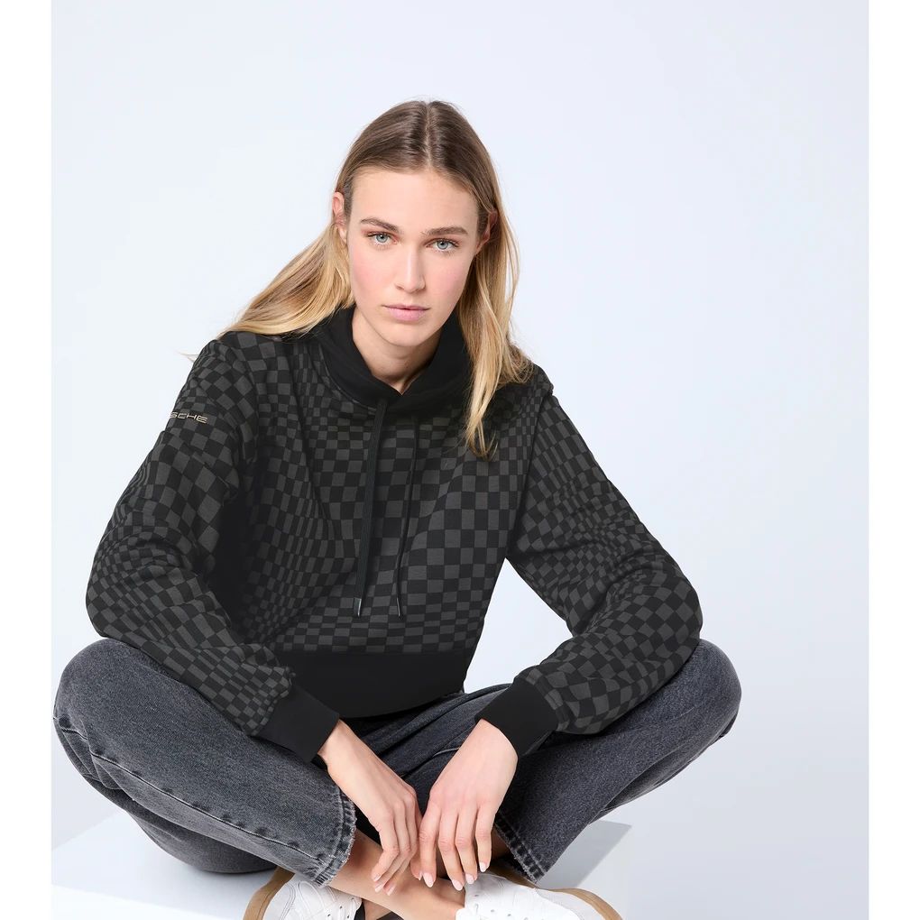 Eine Hommage an ikonisches Design und sportliche Eleganz – das legendäre Pascha-Muster verleiht der Porsche 911 Spirit 70 Kollektion ihren markanten Look. Der Hoodie beeindruckt mit seinem Allover-Pascha-Print und wird durch die kontrastierende Känguru-Tasche mit mattem „Icons of Cool"-Badge zum Eyecatcher. Die Kordeln mit Logo-Details unterstreichen den sportlich-eleganten Look. Abgerundet wird das Design von Rippbündchen an den Ärmeln.