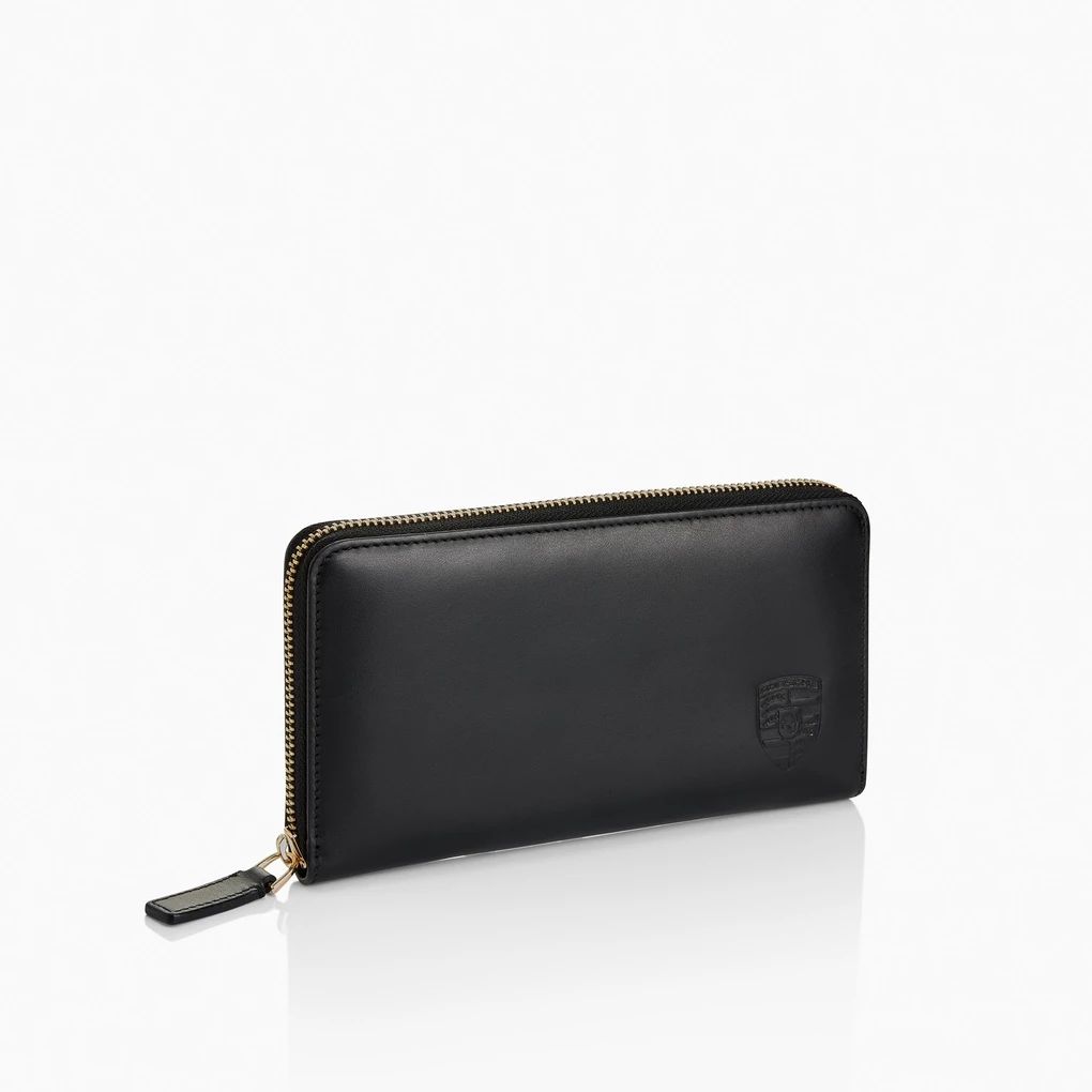 Schwarzer Pullover mit schwarzem Porsche-Schriftzug auf der Brust. Der Pullover hat eine graue Tasche am Bauch, die durch einen roten Reißverschluss auf der rechten Seite geöffnet werden kann. Auf der linken Vorderseite des Pullovers ist über der Nahtkante das Porsche Motorsport Story-Label aufgenäht.