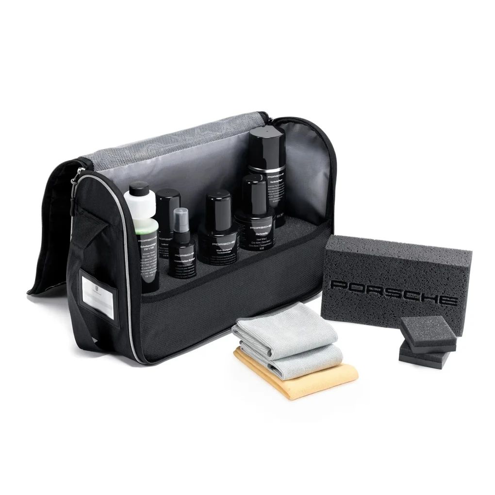 Optimal abgestimmte Pflegeserie in einer praktischen Tragetasche mit Zubehör. Enthält hochwertige, speziell für Porsche Fahrzeuge freigegebene Pflegeprodukte für das Interieur und Exterieur des Fahrzeugs.