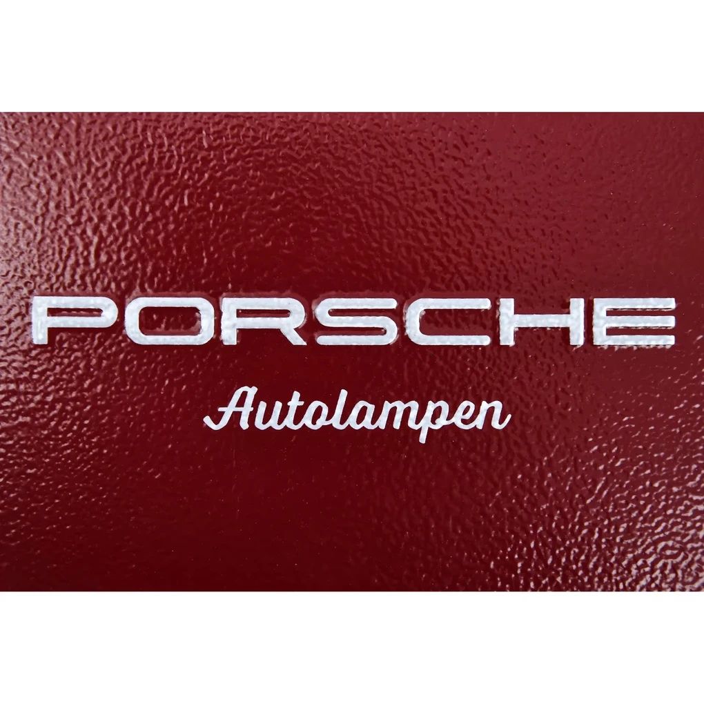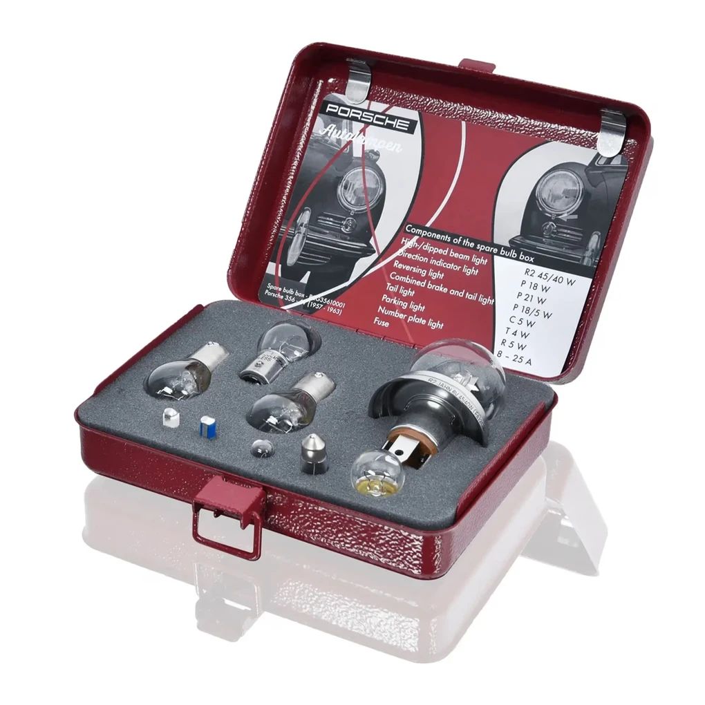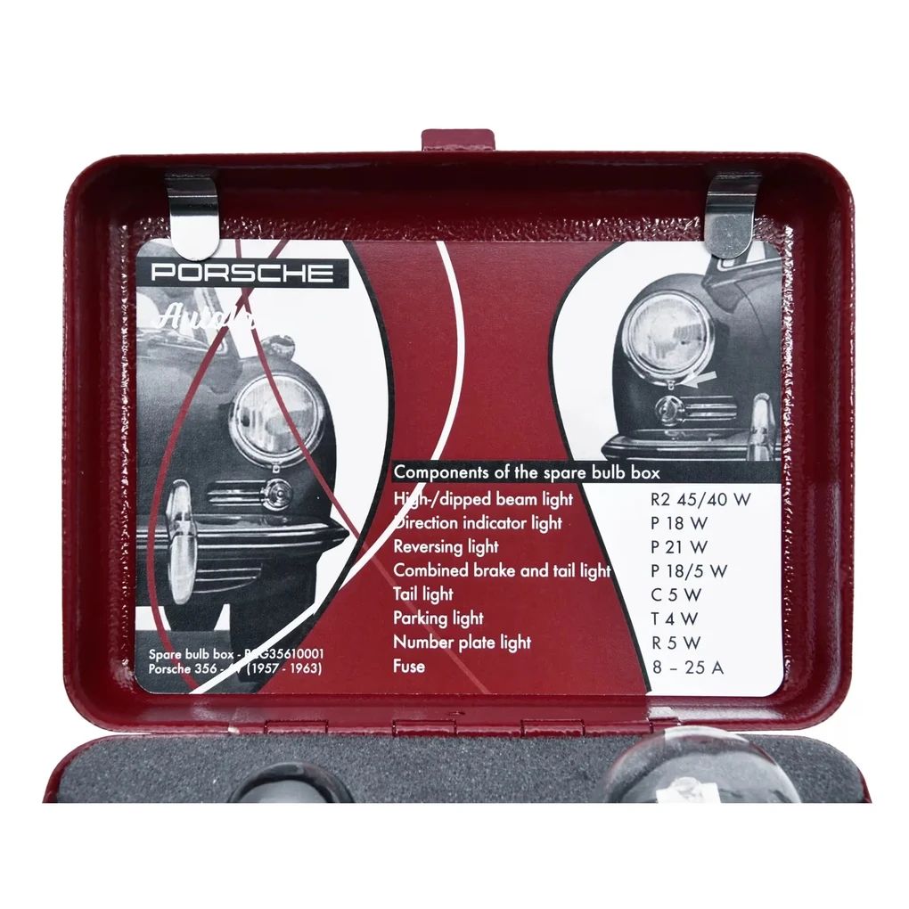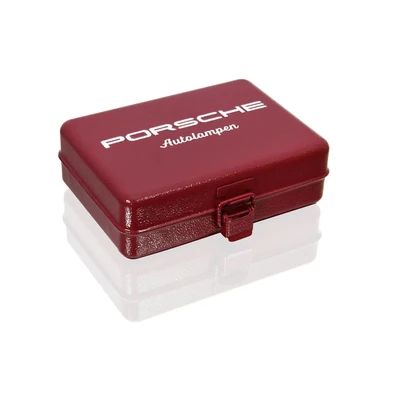 Aufbewahrt werden die Lampen und Sicherungen in einer Metallbox in historischem Porsche Rot, mit erhabenem Porsche Schriftzug in Weiss und mit einer Schaumstoffeinlage innen.