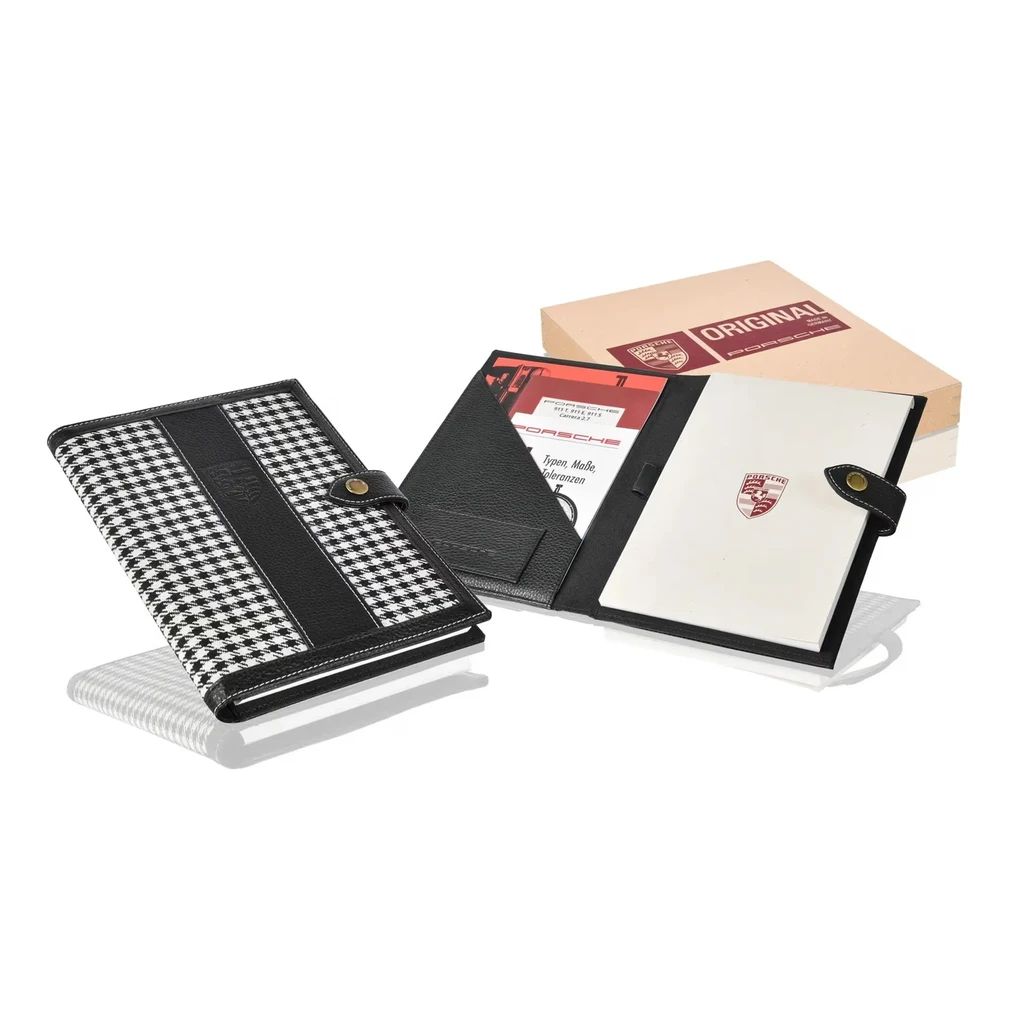 Die neue Dokumentenmappe kombiniert im Stil des 911 Innenraums der Modelljahre 1964 bis 1973 Pepitastoff und Leder. Abgerundet wird das Erscheinungsbild durch einen Magnetverschluss, das geprägte Porsche Fahrzeugwappen auf dem Cover und dem ebenfalls geprägten Porsche Schriftzug im Innenteil.
