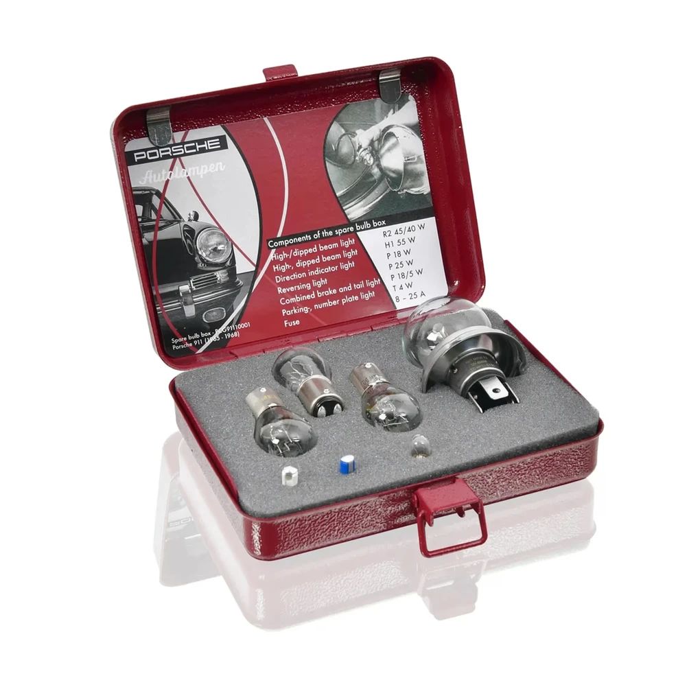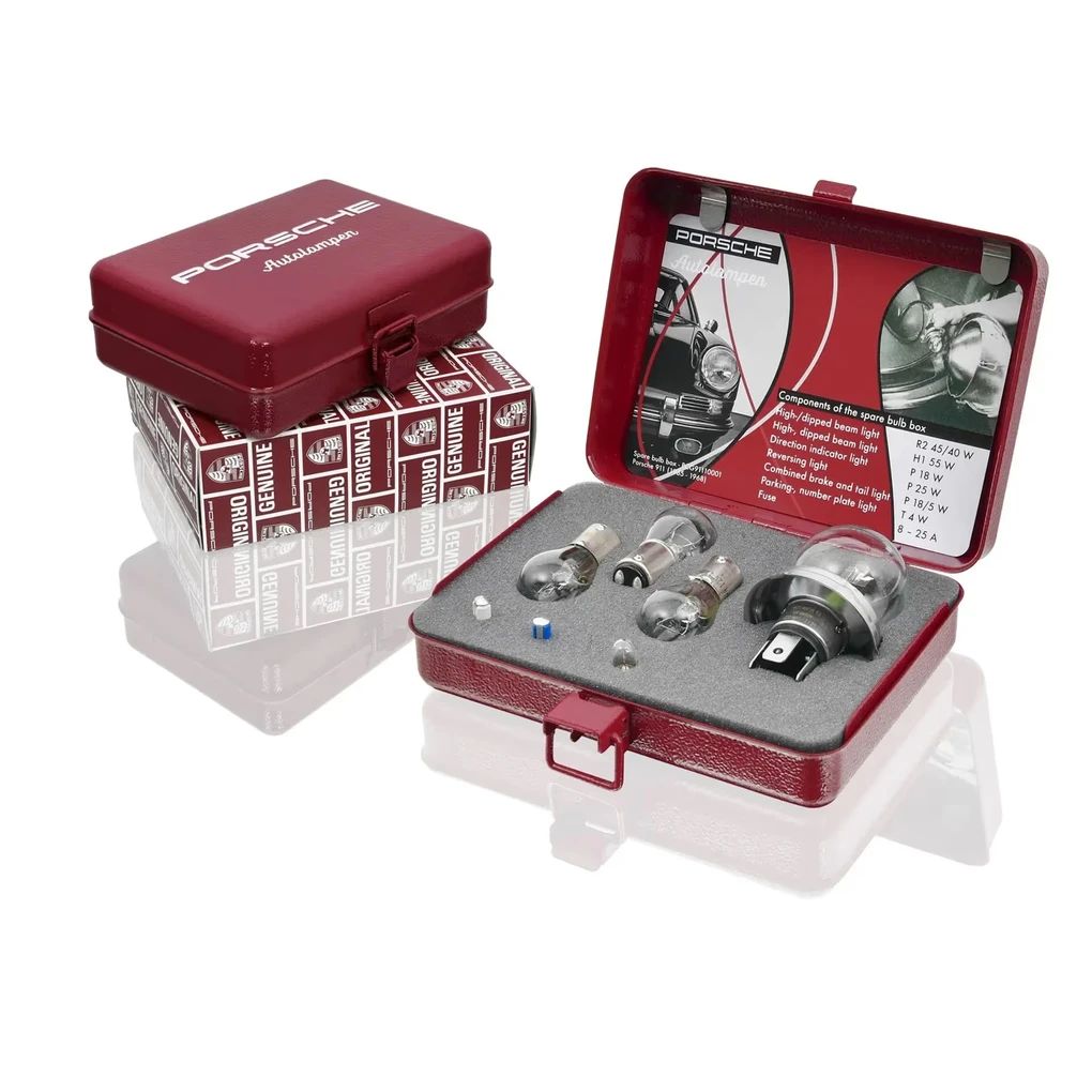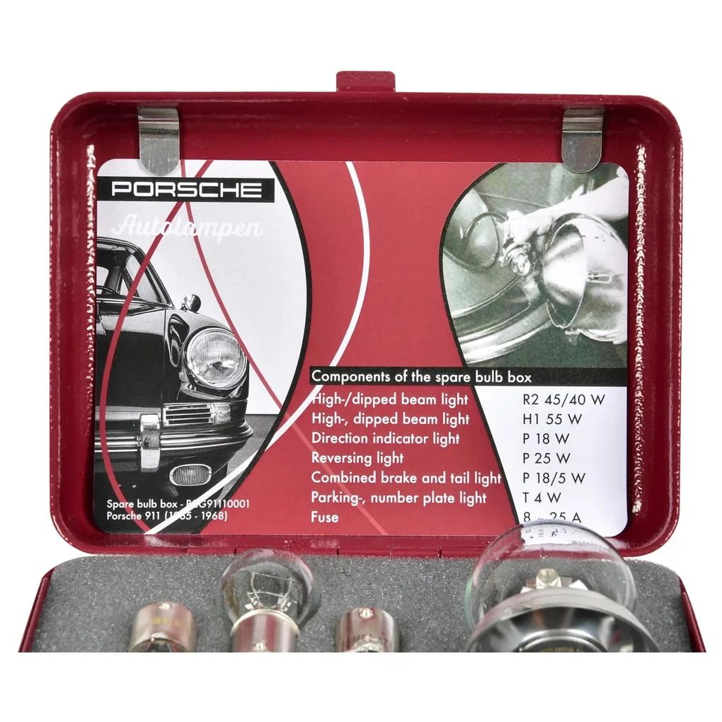Aufbewahrt werden die Lampen und Sicherungen in einer Metallbox in historischem Porsche Rot, mit erhabenem Porsche Schriftzug in Weiss und mit einer Schaumstoffeinlage innen.