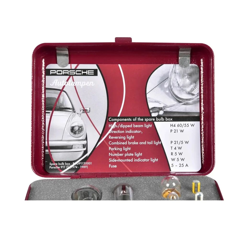 Aufbewahrt werden die Lampen und Sicherungen in einer Metallbox in historischem Porsche Rot, mit erhabenem Porsche Schriftzug in Weiss und mit einer Schaumstoffeinlage innen.