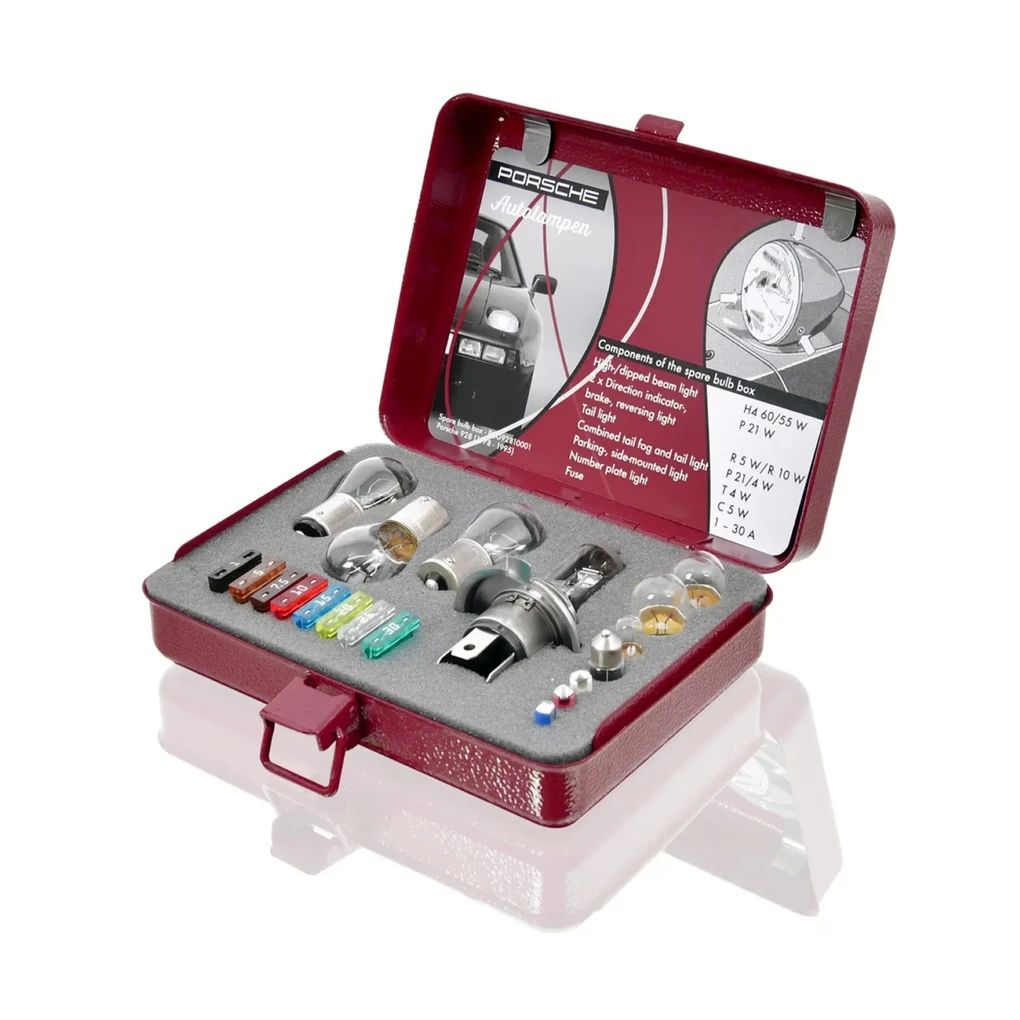 Aufbewahrt werden die Lampen und Sicherungen in einer Metallbox in historischem Porsche Rot, mit erhabenem Porsche Schriftzug in Weiss und mit einer Schaumstoffeinlage innen.
