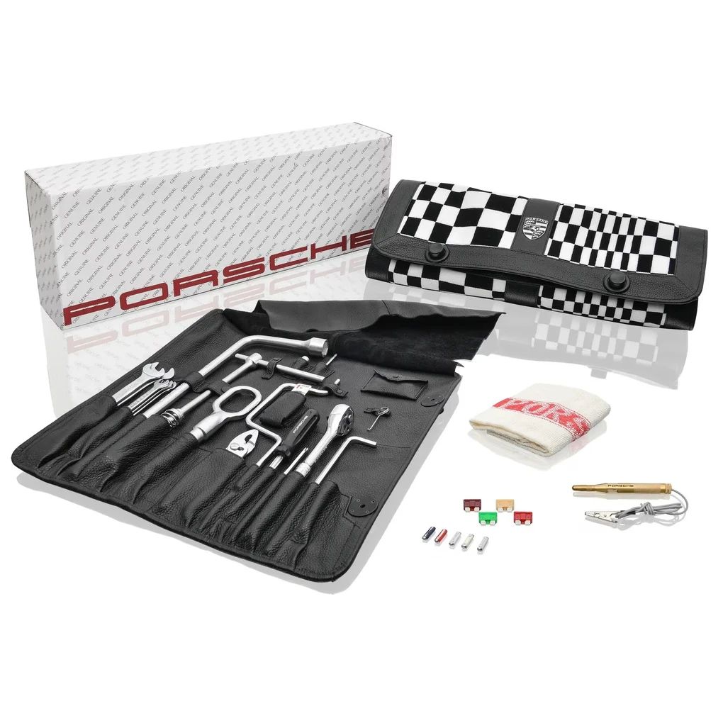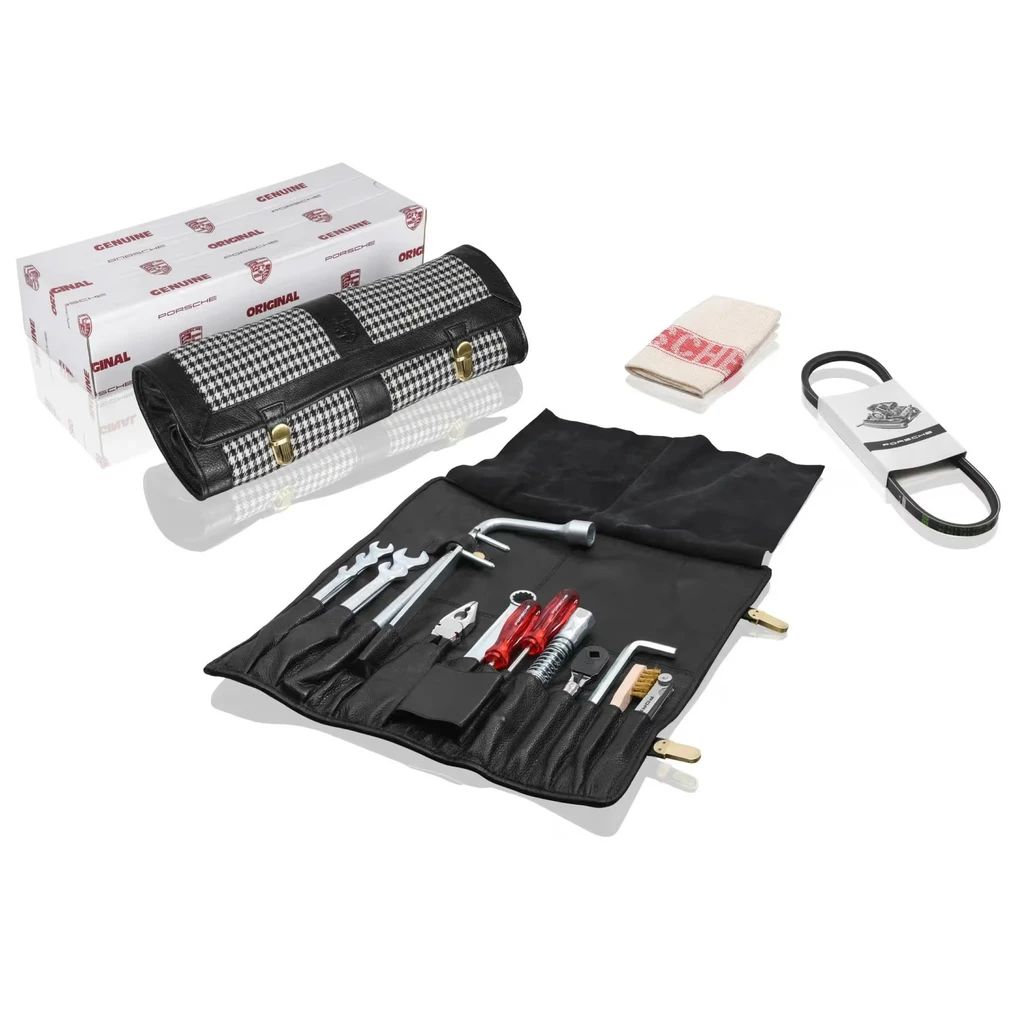 Der Inhalt wurde anhand der originalen Werkzeugtasche rekonstruiert und mit Hilfe der technischen Zeichnungen der Werkzeuge beim Original-Lieferanten von damals neu aufgelegt. Im letzten Schritt wurde die Tasche von den Experten von Porsche Classic optisch und technisch aufgewertet sowie um nützliche Werkzeuge erweitert.