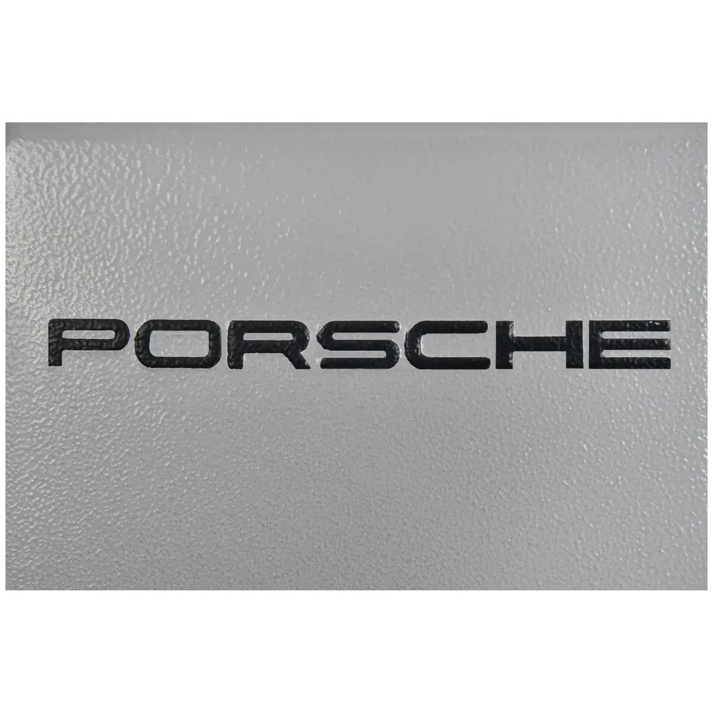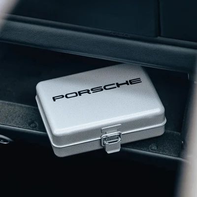 Aufbewahrt werden die Lampen und Sicherungen in einer Metallbox in historischem Porsche Silber, mit erhabenem Porsche Schriftzug in Schwarz und mit einer Schaumstoffeinlage innen.