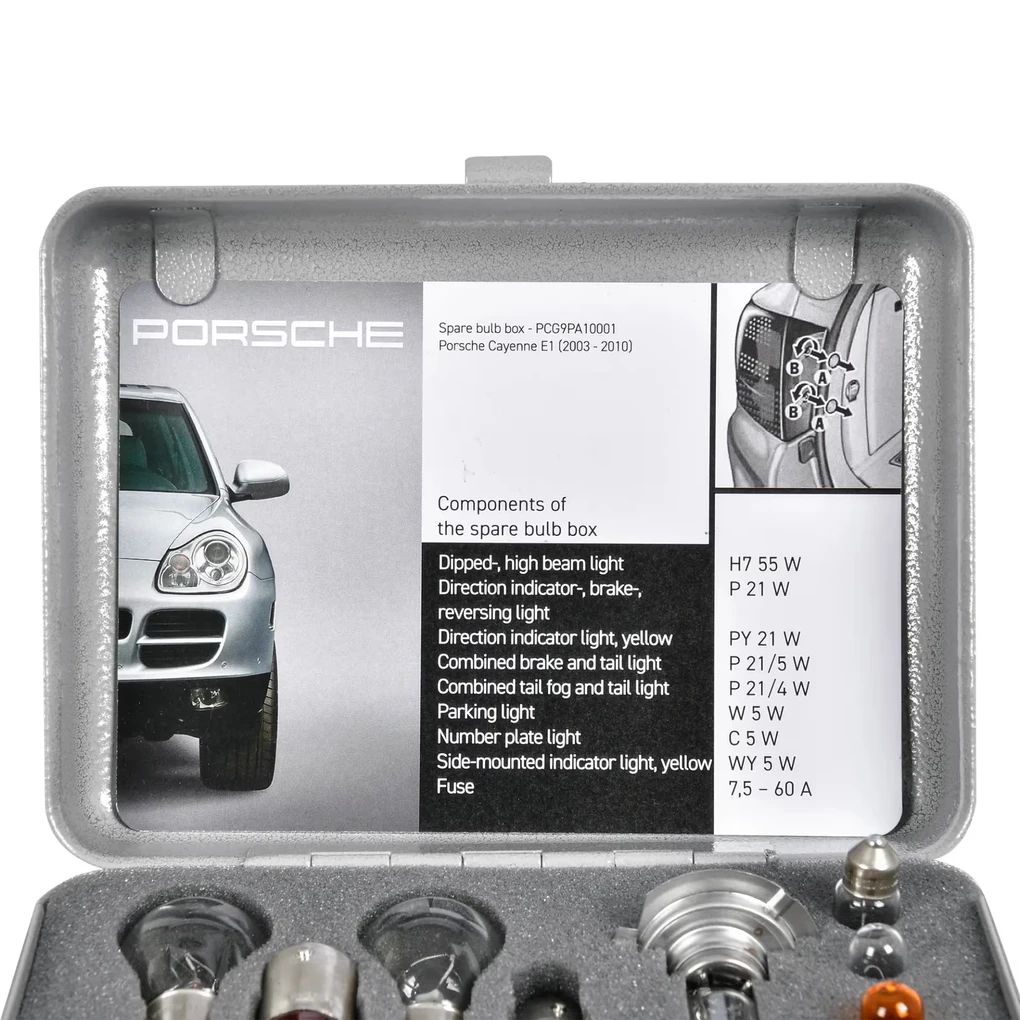 Set aus Glühlampen und Sicherungen (12V), speziell für den Porsche Cayenne E1 zusammengestellt.