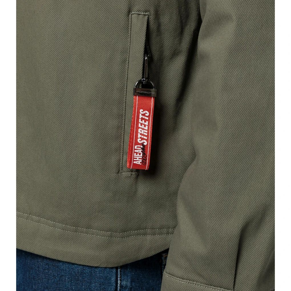 Roadtrip trifft auf Lifestyle: Die AHEAD-Kollektion verbindet Pioniergeist und Abenteuerlust mit ikonischem Design. Die Jacke aus hochwertiger Baumwolle verspricht sowohl Komfort als auch Langlebigkeit. Ein Highlight ist ihr bequemer Cord-Kragen. Die aufgesetzten Taschen auf Brusthöhe mit Truckknöpfen und der eingestickte Porsche Schriftzug über der linken Brust unterstreichen die Detailgenauigkeit des Designs. Die Front lässt sich mit gebrandeten Knöpfen verschließen. Für Funktionalität sorgen zwei seitliche Taschen auf Hüfthöhe, sicher verschließbar durch Reißverschlüsse. Ein großflächiges AHEAD-Badge auf der Rückseite macht die Jacke zu einem wahren Eyecatcher. Größenverstellbare Ärmelsäume mit zwei Knöpfen fügen sich nahtlos in den sportlichen Look ein. Eine zusätzliche Innentasche mit Reißverschluss bietet praktischen Stauraum für Essentials. Als zusätzliches Extra ist ein abnehmbarer Schlüsselanhänger mit dem Schriftzug AHEAD an den Seitentaschen angebracht.