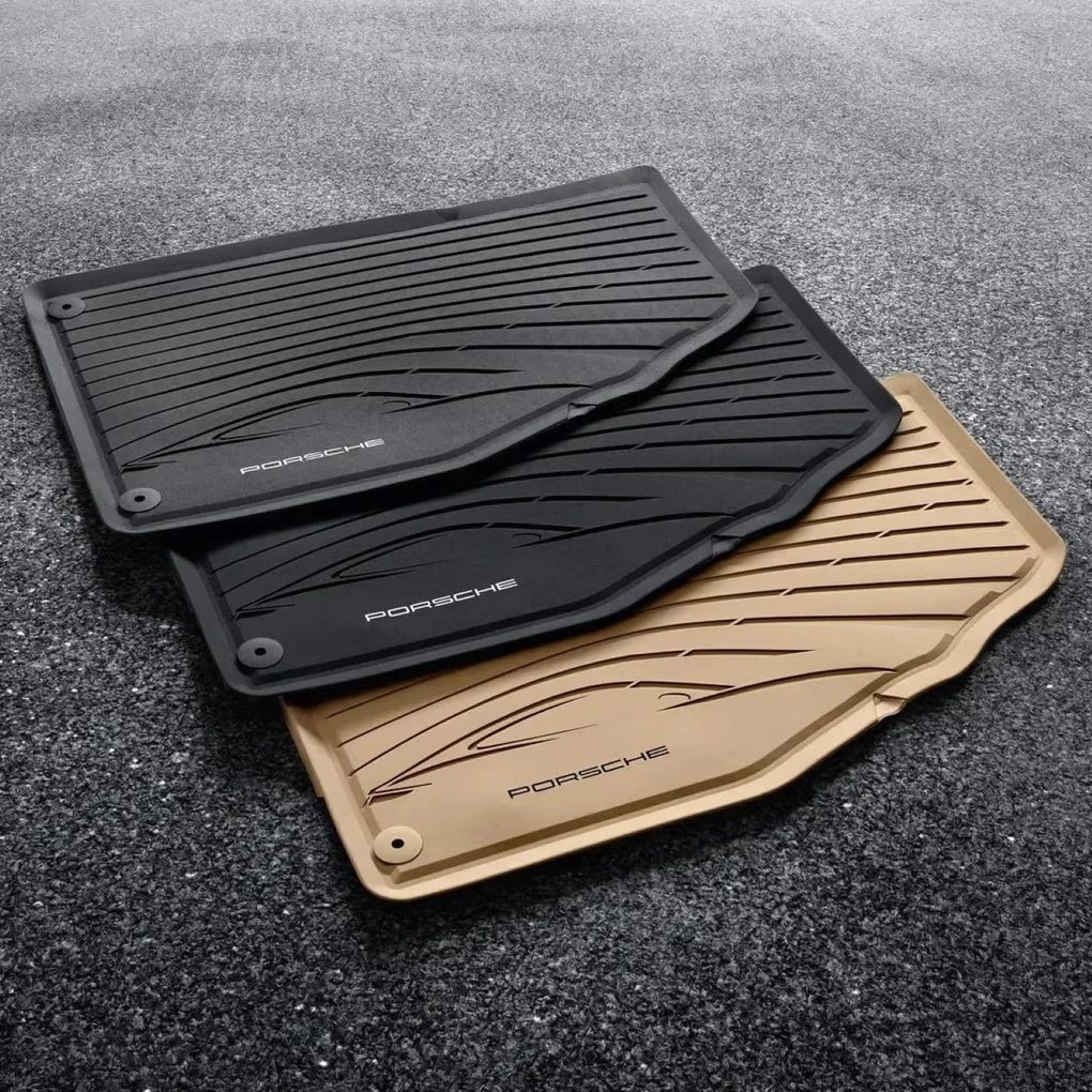 Zweiteiliger Satz in ansprechendem Design mit Fahrzeugsilhouette und „PORSCHE“ Schriftzug. Verrutschsicher und wasserundurchlässig. Mit hochgezogenem, umlaufendem Rand.