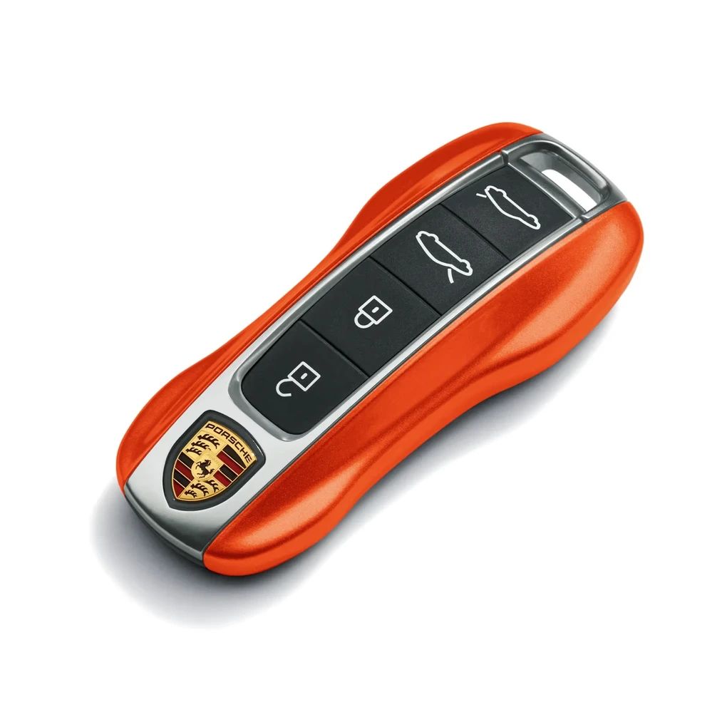 Die lackierten Seitenwangen in ausgewählten Exterieurfarben sind die perfekte Ergänzung für Ihren Porsche Fahrzeugschlüssel.