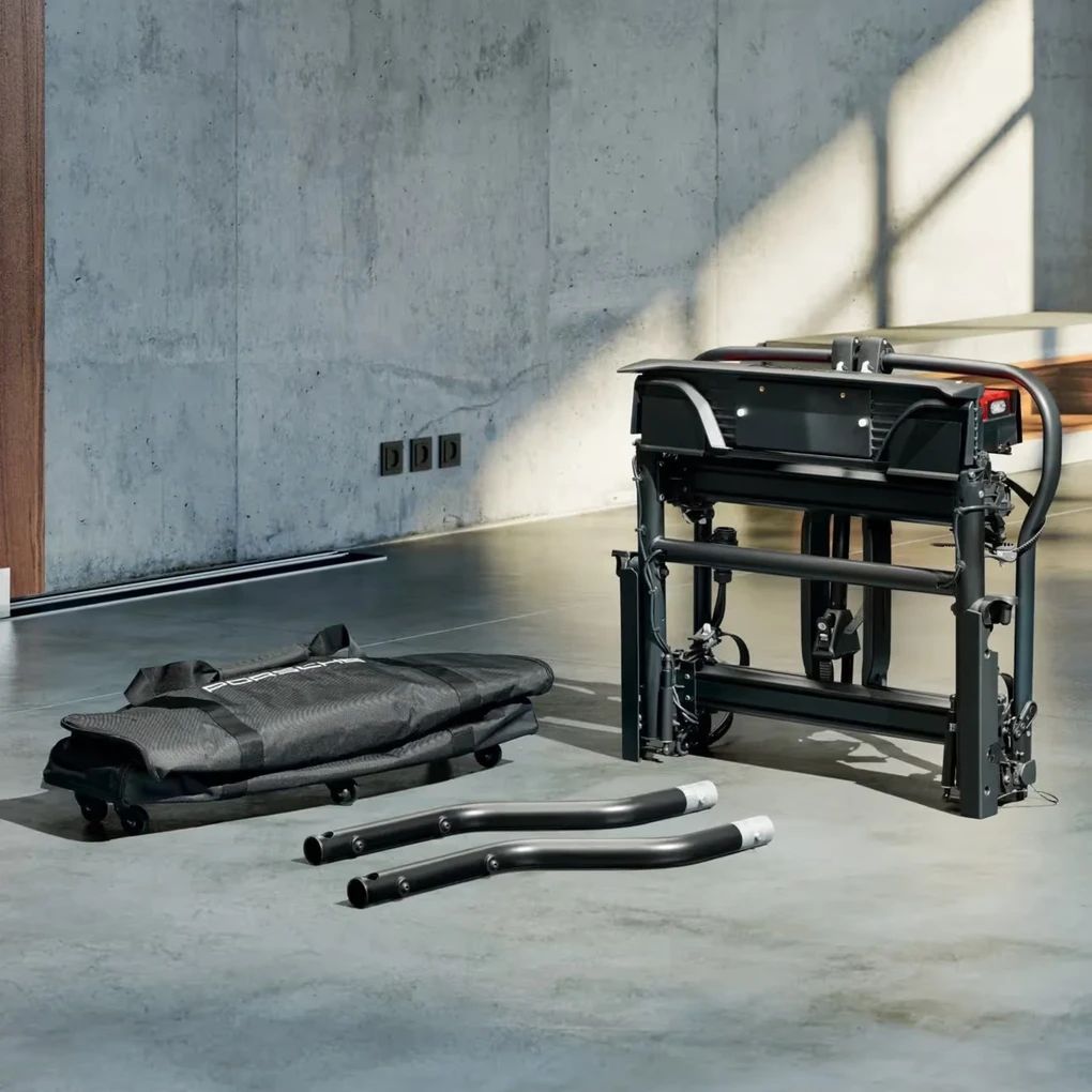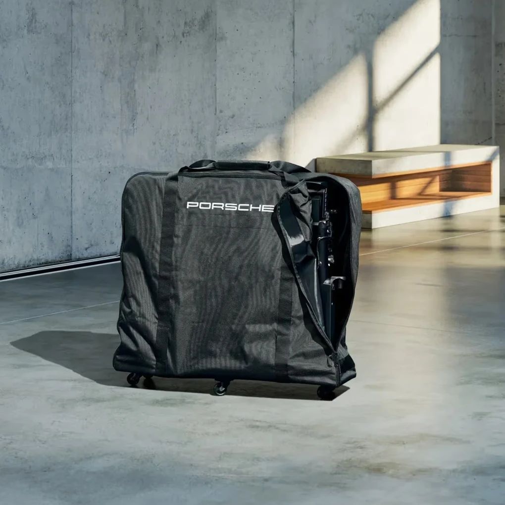 Die hochstabile Transporttasche mit rundum laufendem Reißverschluss ist speziell auf die Abmessungen des Fahrradheckträgers abgestimmt und lässt sich dank Rollen und Trageschlaufen besonders vielseitig handhaben. Der „PORSCHE“-Schriftzug unterstreicht die hochwertige Verarbeitung und die durchdachte Funktionalität der Transporttasche.