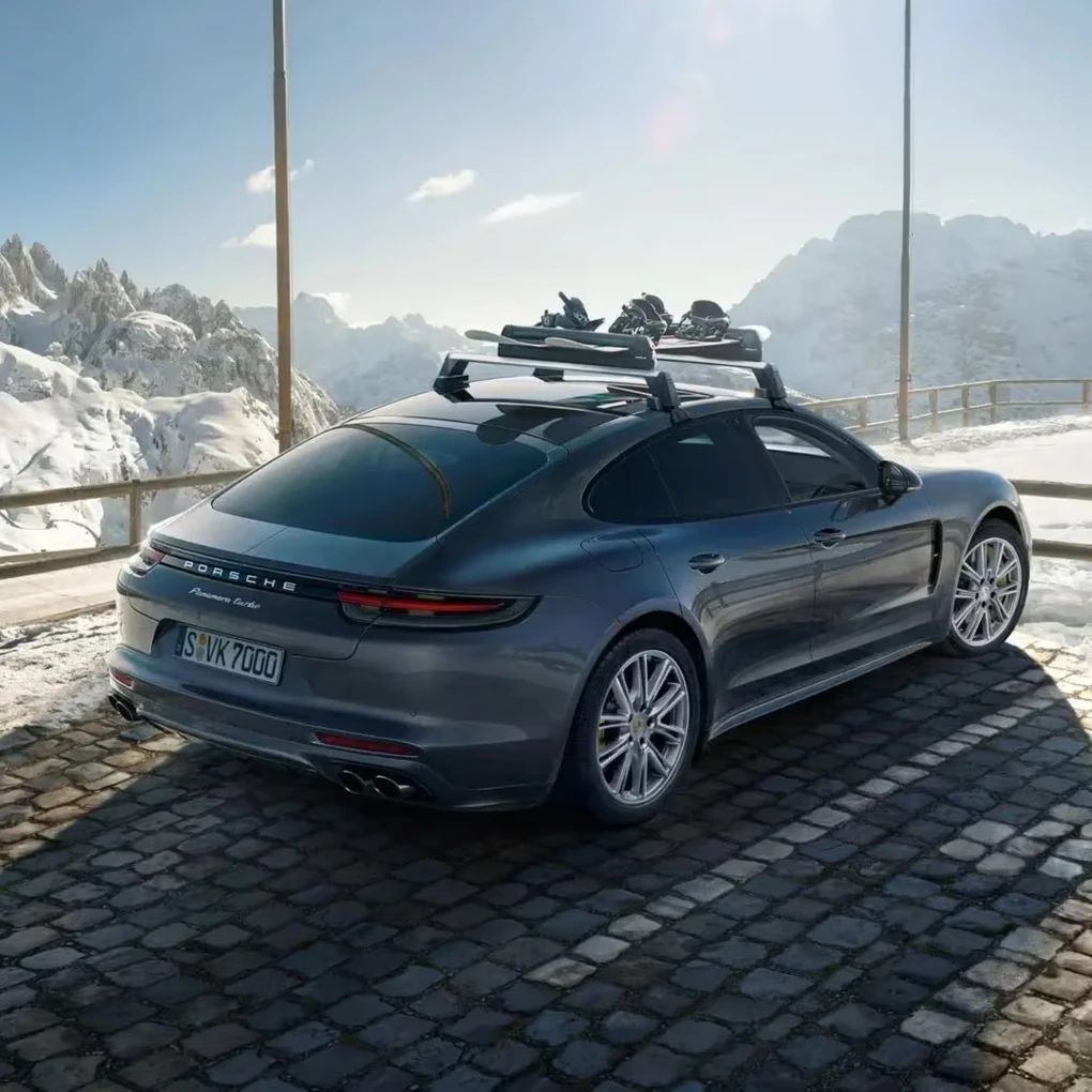 Ski- und Snowboardhalter mit „PORSCHE" Schriftzug für den sicheren Transport von bis zu 5 Paar Ski oder 2 Snowboards.