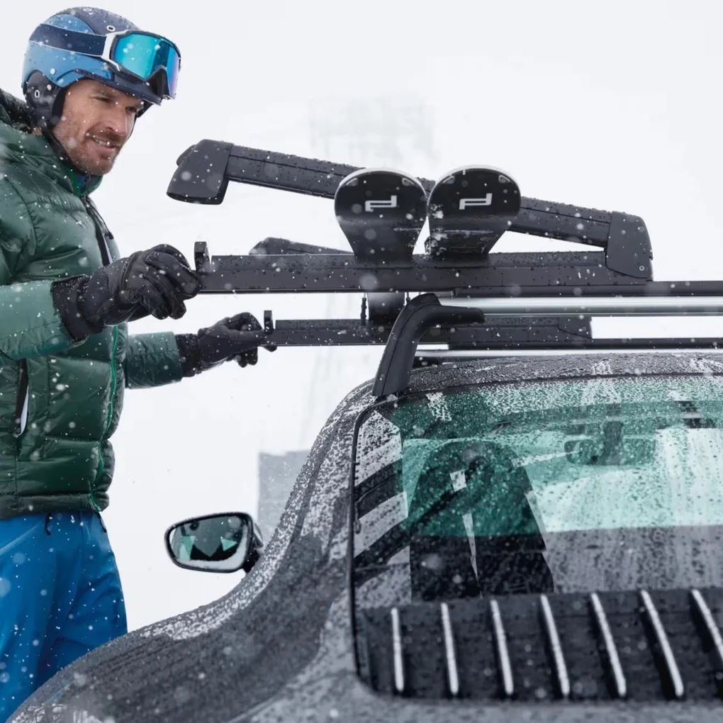Dank großer Tasten lässt sich der Träger auch mit Handschuhen öffnen und schließen. Dabei ermöglicht die Ausziehfunktion ein komfortables Auf- und Abladen, ohne sich über das Fahrzeugdach lehnen zu müssen. Besonders weiche und hohe Gummiauflagen bieten optimalen Schutz für die Oberflächen von Skiern und Snowboards sowie ausreichend Abstand zu Fahrzeugdach, selbst bei hohen Skibindungen.