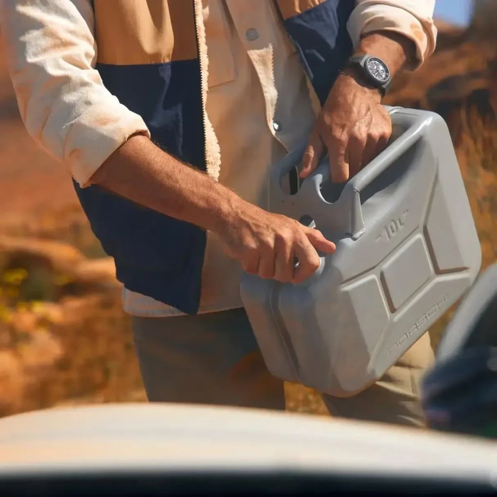 Sein typisches Design, die graue Lackierung und der prägnante „PORSCHE“ Schriftzug passen hervorragend zur robusten Optik des 911 Dakar. Sowohl der Kanister als auch der Ausfülltrichter sind aus dickem Blech gefertigt und widerstehen auch stärkerer mechanischer Beanspruchung.