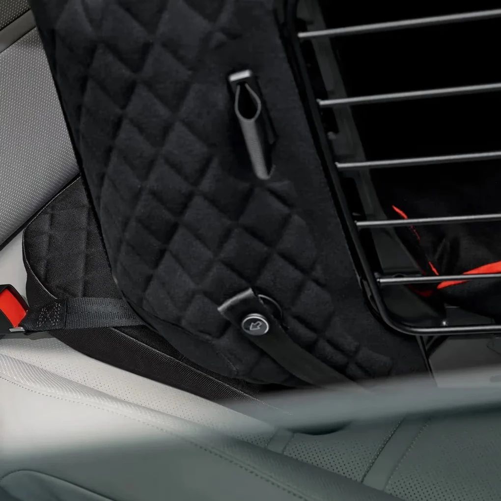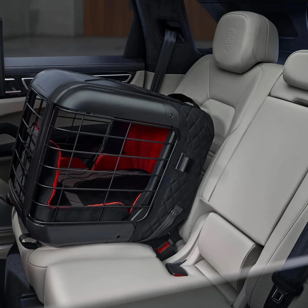 Hinweis: Die Hundetransportbox ist auch mit der Porsche Kindersitzunterlage kompatibel. Diese sorgt für zusätzlichen Schutz der Fahrzeugsitze.