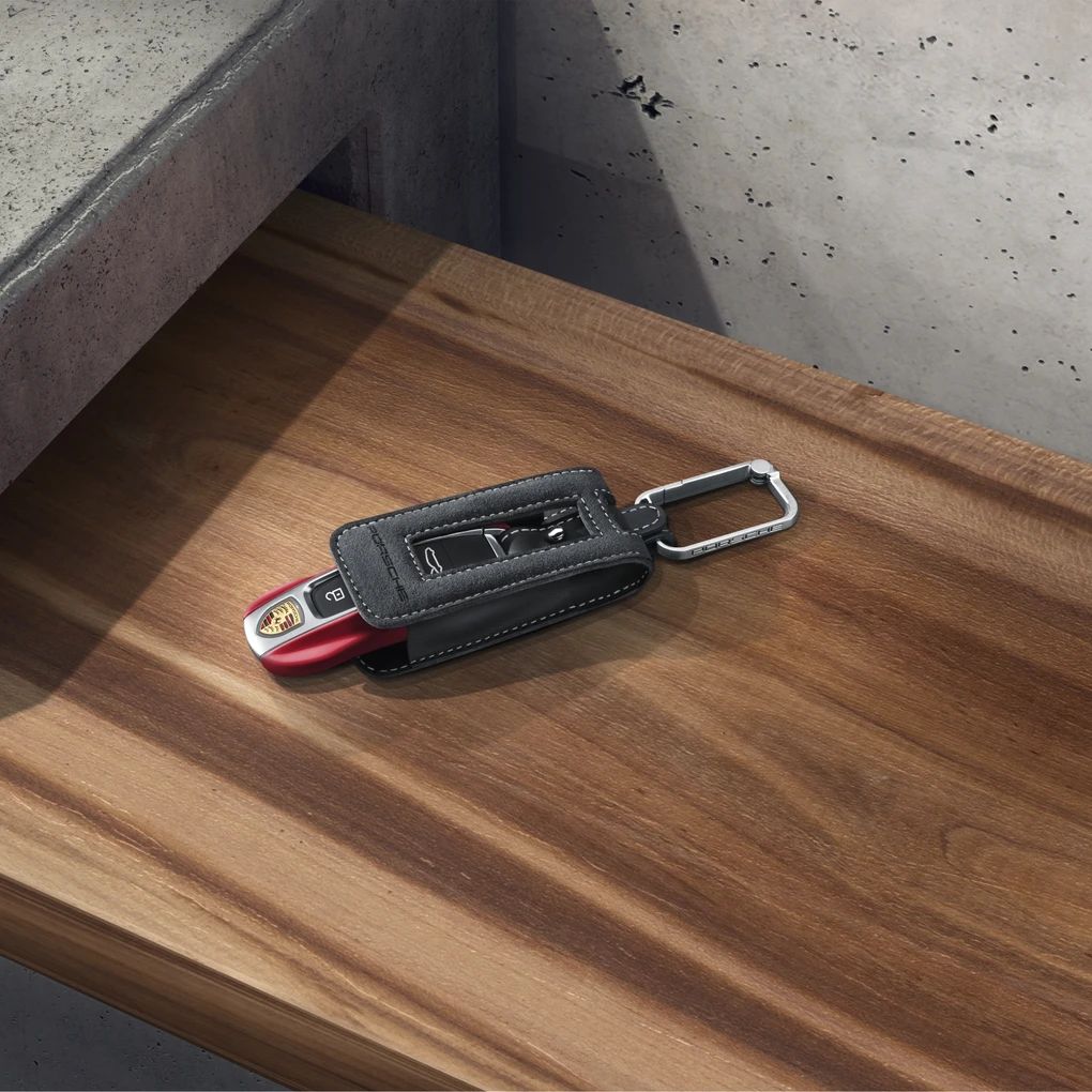 Das Schlüsselband und die Seitenwangen sind in Leder schwarz gehalten. Mit Ziernaht in ausgewählten Farben und mit „PORSCHE“ Schriftzug.