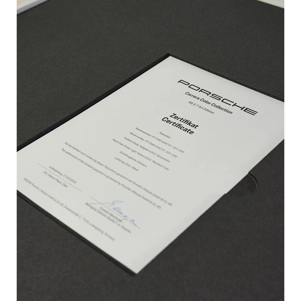 Ein Stück Porsche Geschichte für zu Hause: Die Carrera Color Collection präsentiert als dreigeteiltes Wandbild das markante Seitendekor des Porsche 911 Carrera RS 2.7, inspiriert von der vielfältigen Farbpalette seiner Originalfahrzeuge aus dem Jahr 1972. Hergestellt aus drei ESG-Glastafeln im Format 600x600 mm mit einer Stärke von 4,0 mm besticht jede Tafel durch ihre hochwertige Verarbeitung mit polierten Kanten. Der mit Hinterglas-Siebdruckverfahren aufgebrachte Schriftzug garantiert Langlebigkeit und Farbtreue. Ein besonderes Merkmal ist das auf jeder Tafel dezent applizierte Porsche Wappen. Limitiert auf 1.580 Stück verteilt auf vier Farbvarianten ist jedes Set mit einem Limitierungsaufkleber samt Seriennummer und einem Echtheitszertifikat, unterschrieben von Carsten Monnerjan, versehen.