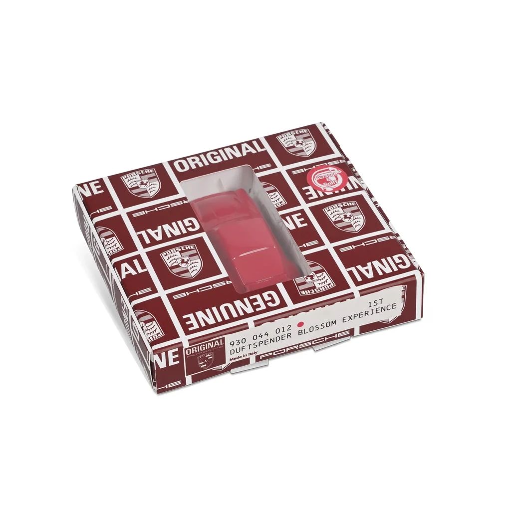 Der Autoduft „Blossom Experience" in klassischem Design ist ein fruchtiger und blumiger Duft, der den Kontrast von Düften wie Rose, Orangenblüte und Moschus vereint. Der Duftspender selbst erstrahlt in der Lackfarbe „Fraise“, die einst für den 911 Turbo erhältlich war. Passend dazu enthält das Set ein originalgetreu nachgebildetes Klebeset, das die Authentizität und den Charme der damaligen Zeit widerspiegelt.
