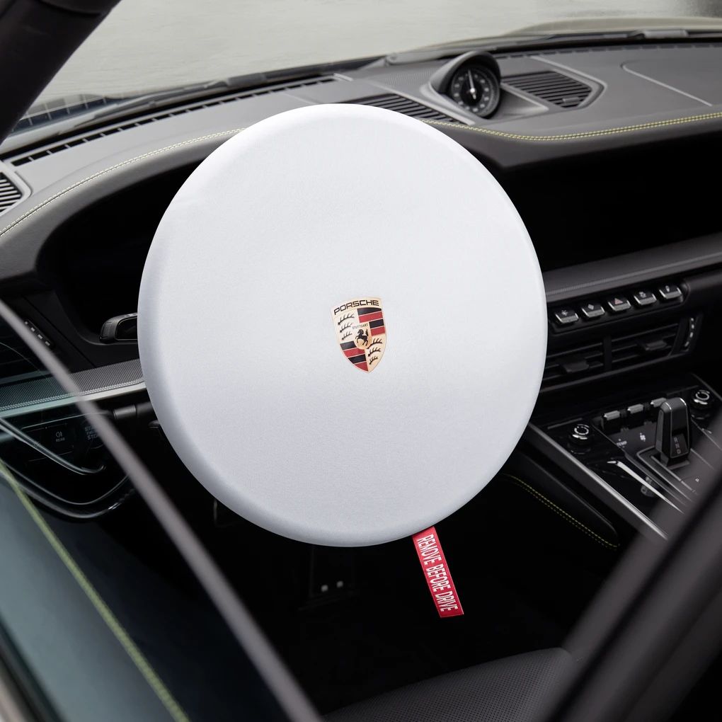 Im Winter, im Urlaub oder über Nacht: Mit dem exklusiven Porsche Lenkrad-Cover pausiert Ihr Fahrzeug stilvoll, egal wie lange. Hergestellt aus atmungsaktivem und antistatischem Material bietet das Lenkrad-Cover mit farbigem Porsche Wappen optimalen Schutz und lässt sich schnell und einfach anbringen – so bleibt Ihr Lenkrad auch während einer Ruhephase in perfektem Zustand. Das Lenkrad-Cover ist in Schwarz, Weiß und Beige erhältlich und kann in der mitgelieferten Tasche aufbewahrt werden.