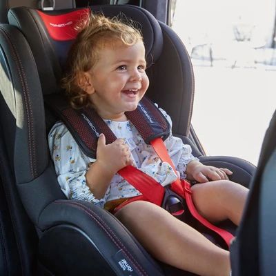 • ein 5-Punkt-Gurtsystem mit Sicherheitsschloss für einen besseren Halt