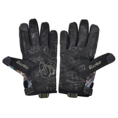 Die Innenhand ziert eine Explosionszeichnung von Teilen der Turbo spezifischen Abgasanlage mit farblich abgesetztem Turbolader, die gleichzeitig für eine verbesserte Grip-Fähigkeit sorgt. Auf dem Handrücken befindet sich die Silhouette des 911 Turbos mit charakteristischem Heckflügel, in der ein Magnet eingelassen ist. Der praktische Magnet hält nicht nur kleine Verbindungselemente wie Schrauben und Muttern sicher, sondern ermöglicht auch eine einfache Befestigung an Ihrer Werkzeugkiste.