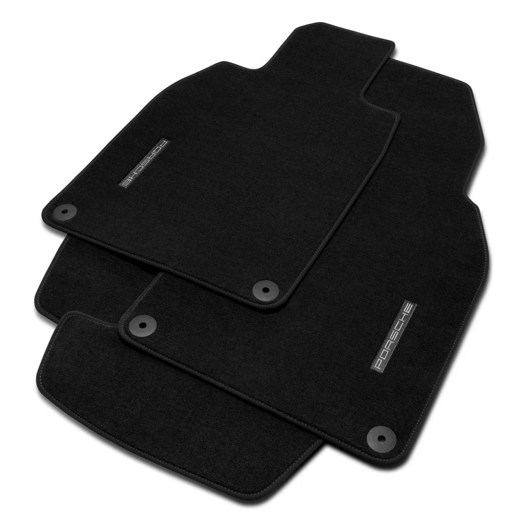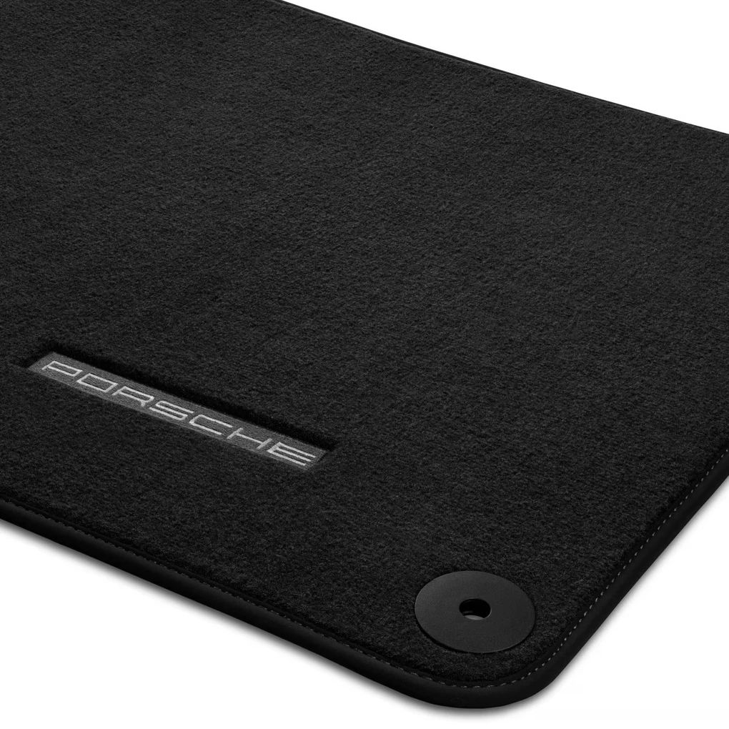 Vierteiliger Satz schwarzer Fußmatten mit Einfassung aus hochwertigem Nubukleder und Einleger mit eingesticktem, silbernen „PORSCHE“ Schriftzug.