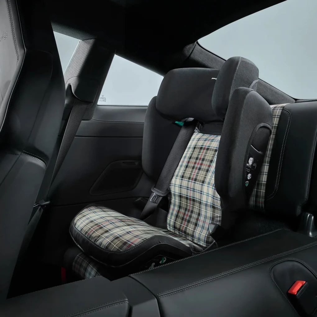 Bei der Stoffwahl für den Kindersitzbezug kommt das originale Schottenkaro-Stoffmuster zum Einsatz, das auch im 911 Turbo 50 Jahre Jubiläumsmodell Verwendung findet. Hier trifft Tradition auf Moderne: für das ikonische Schottenkaro wurde das „Mackenzie“-Muster des Serienmodells von 1974 neu interpretiert und referenziert auf die Eleganz und den Lifestyle der 911 Turbo Historie. Damit sind auch die kleinsten Mitfahrer stilsicher unterwegs.