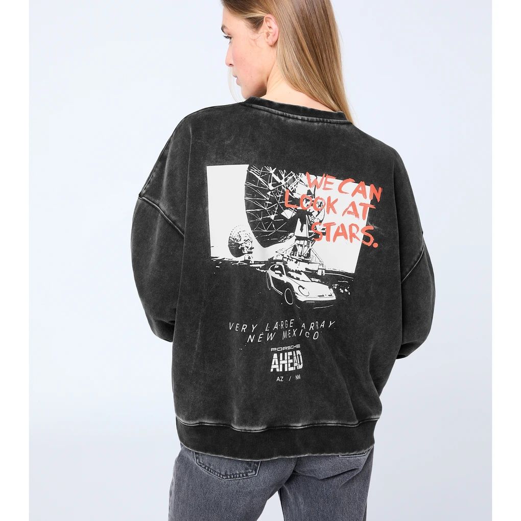 Roadtrip trifft auf Lifestyle: Die AHEAD-Kollektion verbindet Pioniergeist und Abenteuerlust mit unverwechselbarem Design. Mit seinem kastigen Schnitt und dem Rundhalsausschnitt bietet der Unisex-Sweater optimalen Tragekomfort. Der hochwertige Baumwollstoff in Used-Optik mit helleren Kanten und Nähten verleiht dem Sweater einen stylischen Look. Der großflächige Druck auf der Rückseite mit AHEAD Schriftzug macht ihn zum wahren Eyecatcher. Abgerundet wird das Design durch Details wie dem AHEAD Logo am linken Saum sowie dem Porsche Druck auf Taillenhöhe auf der linken Vorderseite.