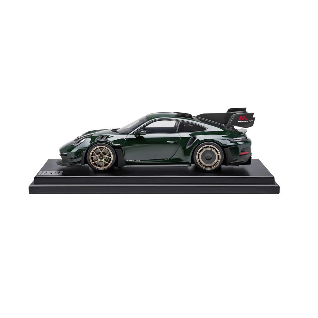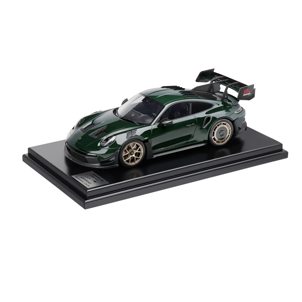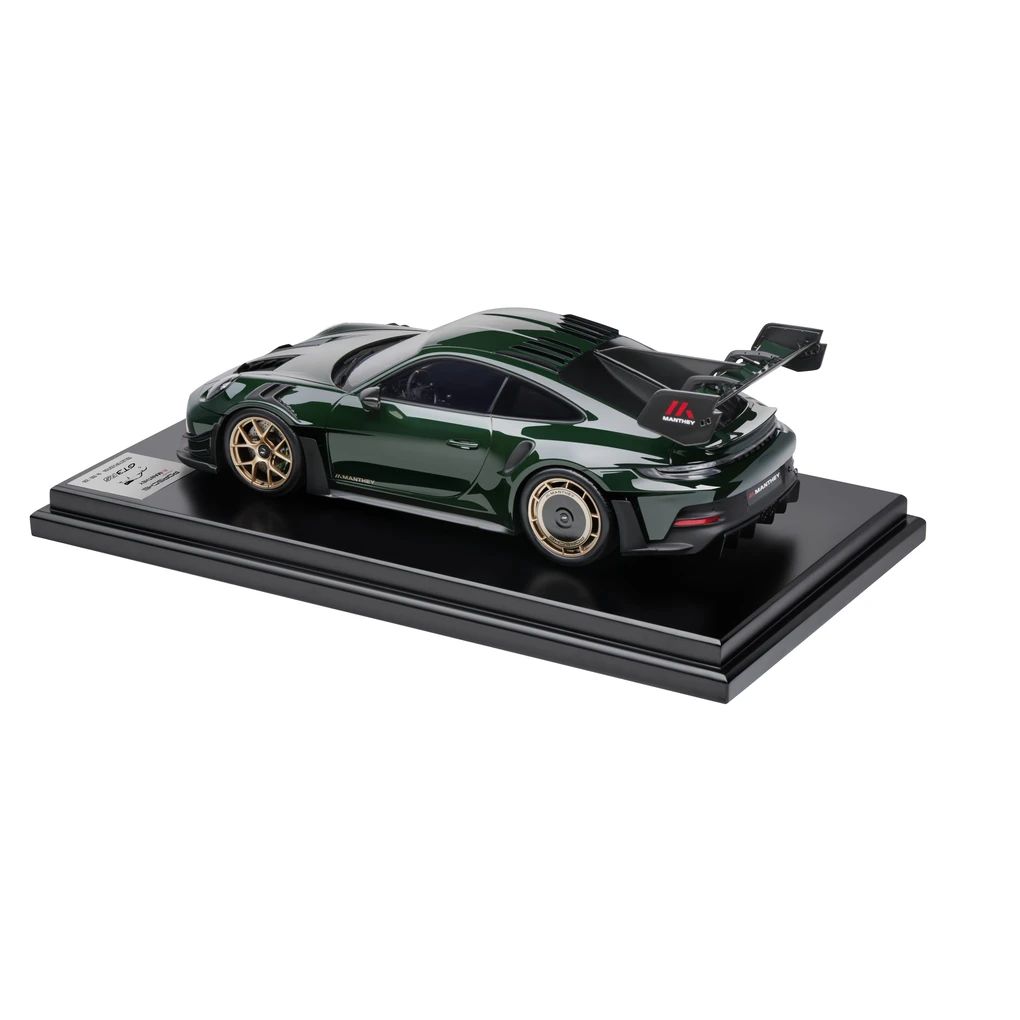 Das exklusive Modell des Porsche 911 GT3 RS 992 mit Manthey Kit im Maßstab 1:12 überzeugt mit seiner Detailtreue und darf in keiner Sammlung fehlen. Besteht aus Resine. Exterieur in Brewster Green, Interieur in Schwarz. Limitiert auf 200 Stück.