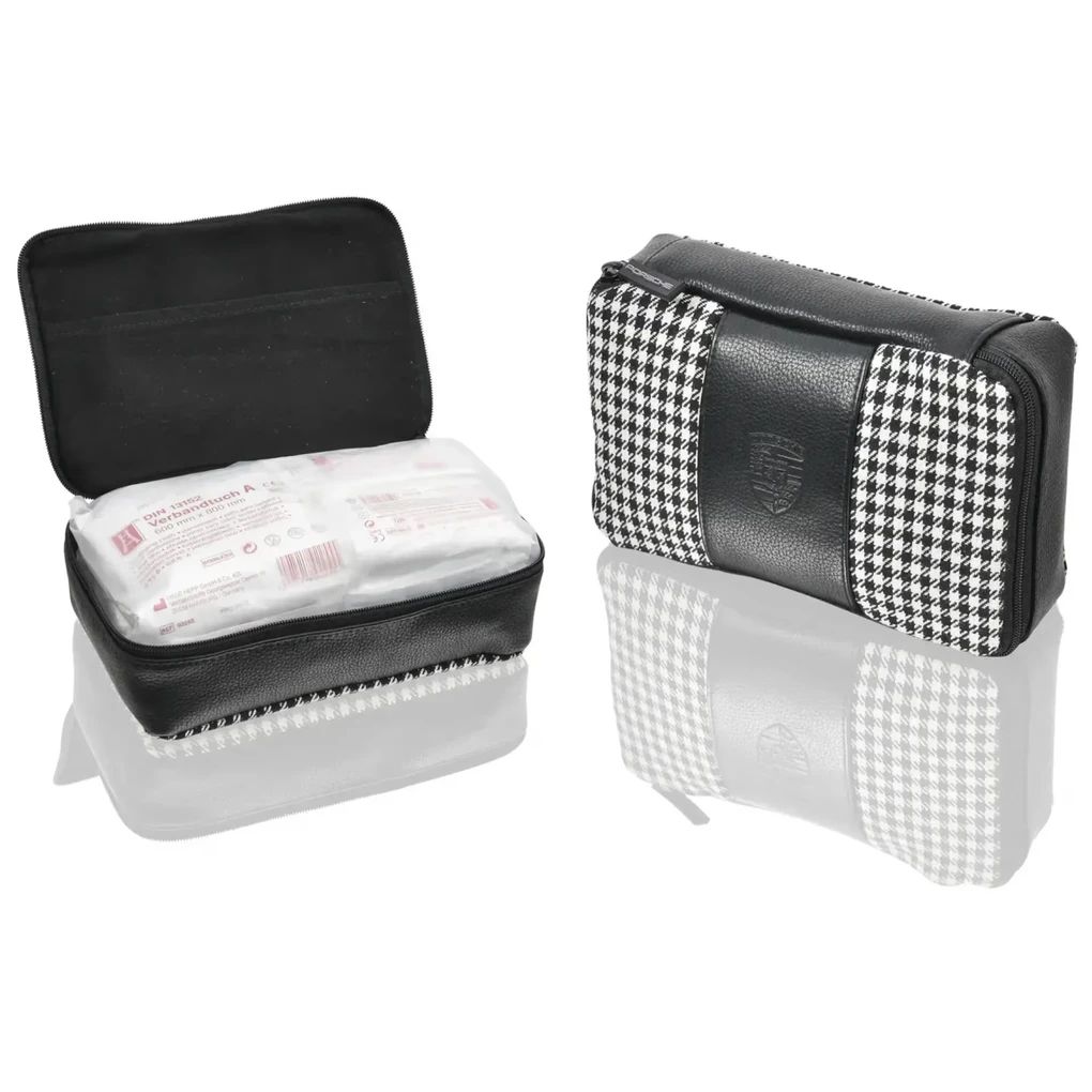 Die Porsche Classic Verbandtasche im klassischen Pepita Design enthält ein vollständiges Erste-Hilfe-Set nach DIN 13164.