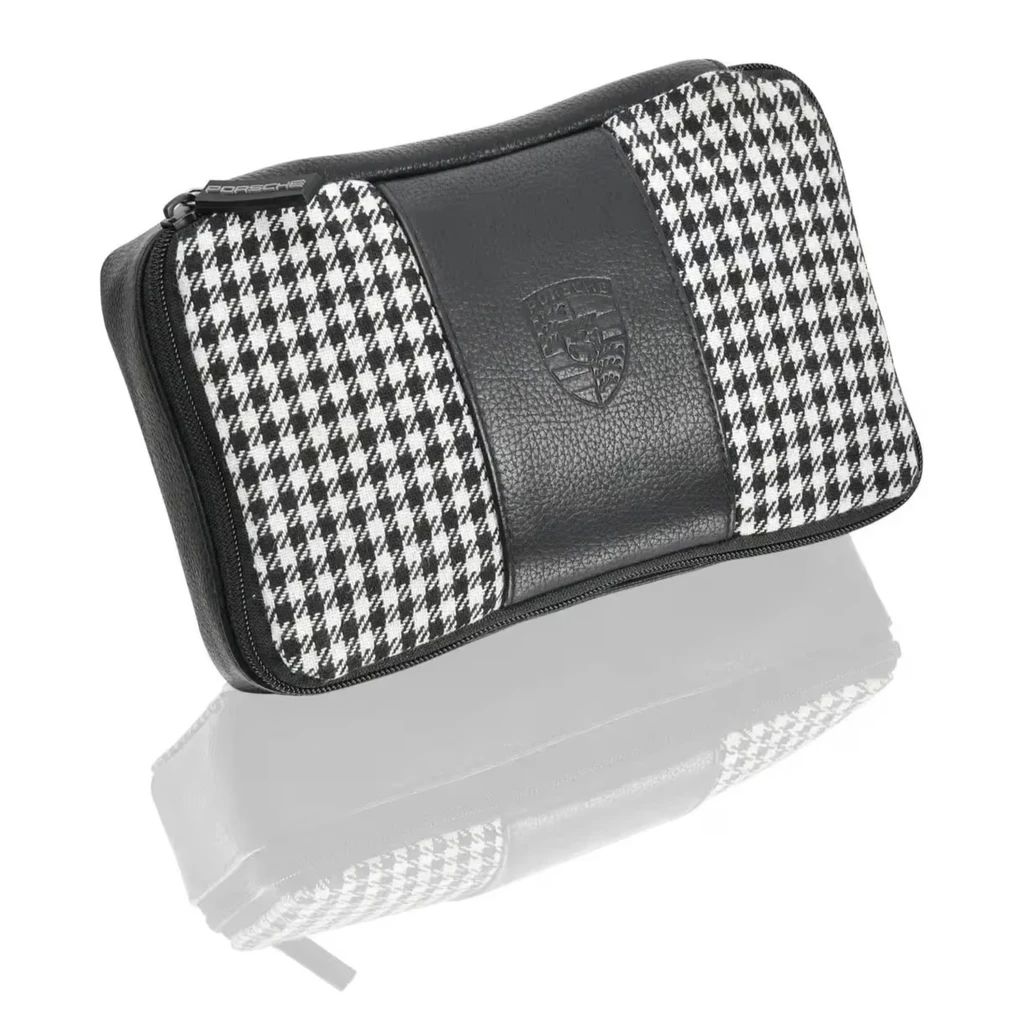 Von Porsche Classic ab sofort für Ihren Klassiker erhältlich: Die Verbandtasche im zeitgenössischen Pepita Design und mit geprägtem Porsche Wappen im schwarzen Leder.