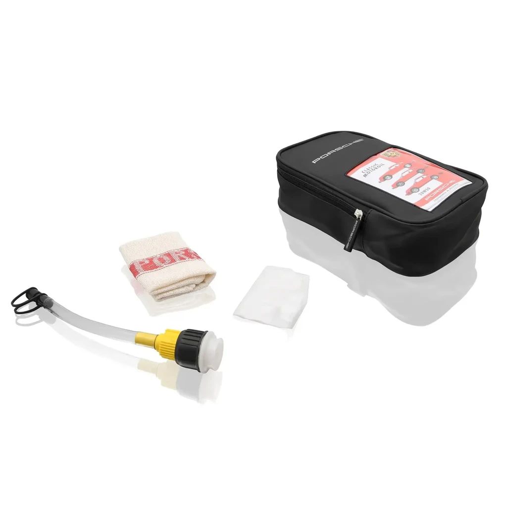 Im Lieferumfang enthalten sind die Zubehörprodukte, die zum Einfüllen des Öls benötigt werden. Hierzu befinden sich ein aufzuschraubender Einfüllstutzen, Einmalhandschuhe sowie ein Porsche Classic Putztuch bereits in der Tasche.