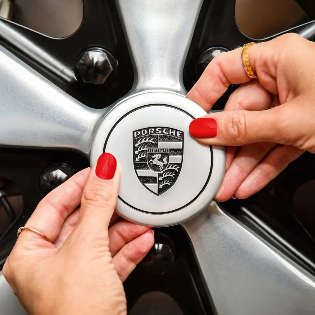 Radzierdeckel 71 mm silber mit schwarzem, geprägten Porsche Wappen.