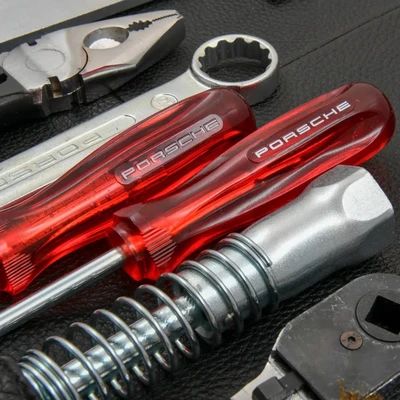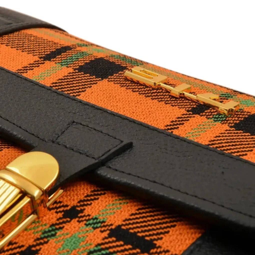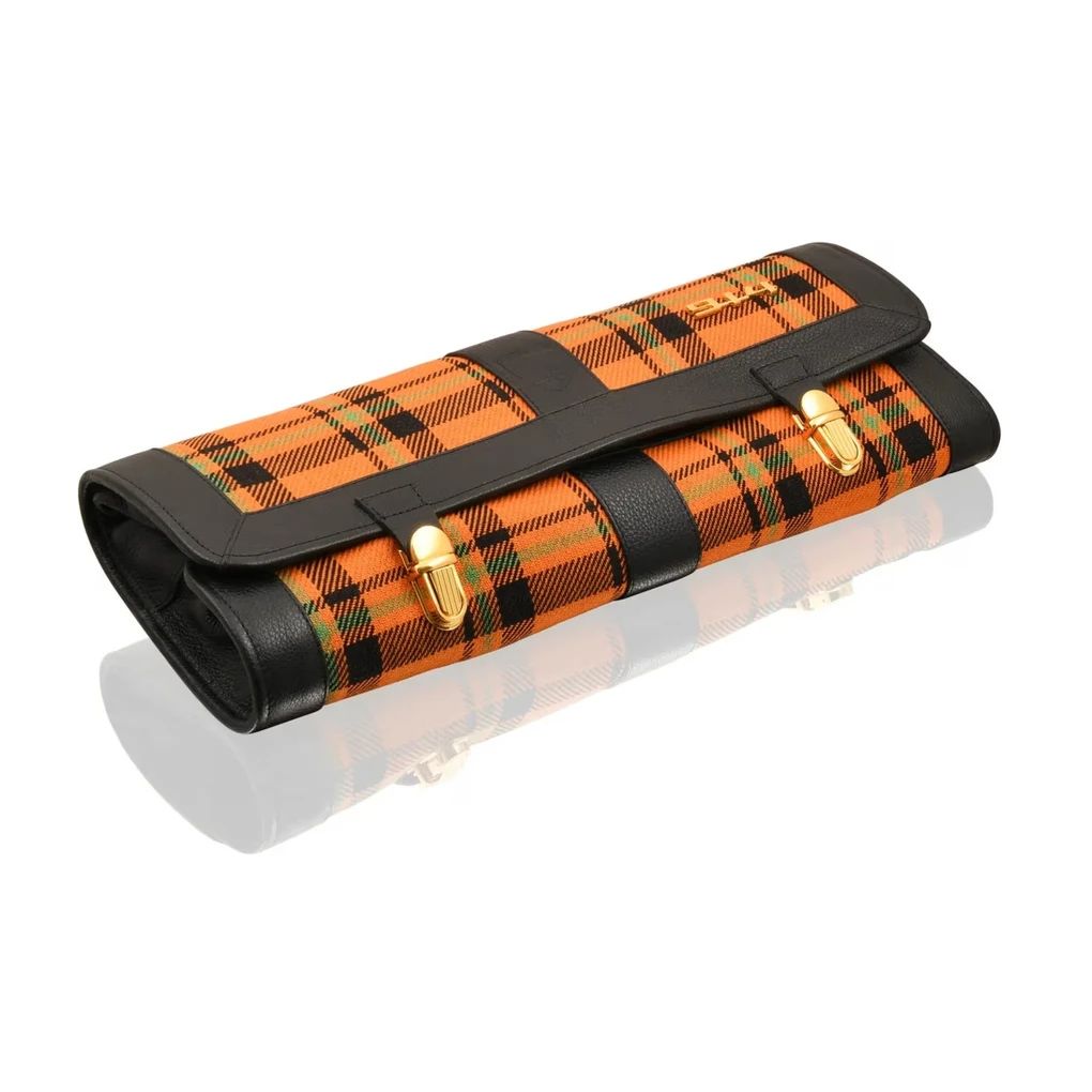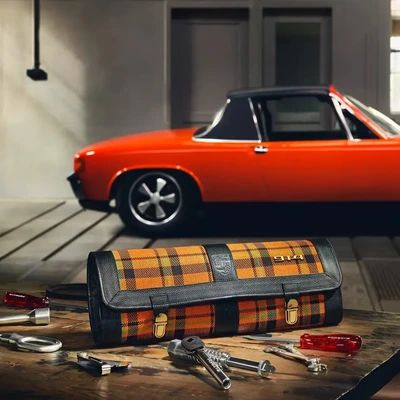 Ein orangefarbener Schottenkaro Stoff (Tartan) prägt die äußere Anmutung der neuen Tasche. Die Optik greift das Design der 914er Sitzbezüge auf. Die Werkzeugtasche besitzt auf der Vorderseite zudem ein gestempeltes Porsche Wappen, wie es einst auf dem Hupenknopf der Sechszylinder-Version 914/6 zum Einsatz kam.