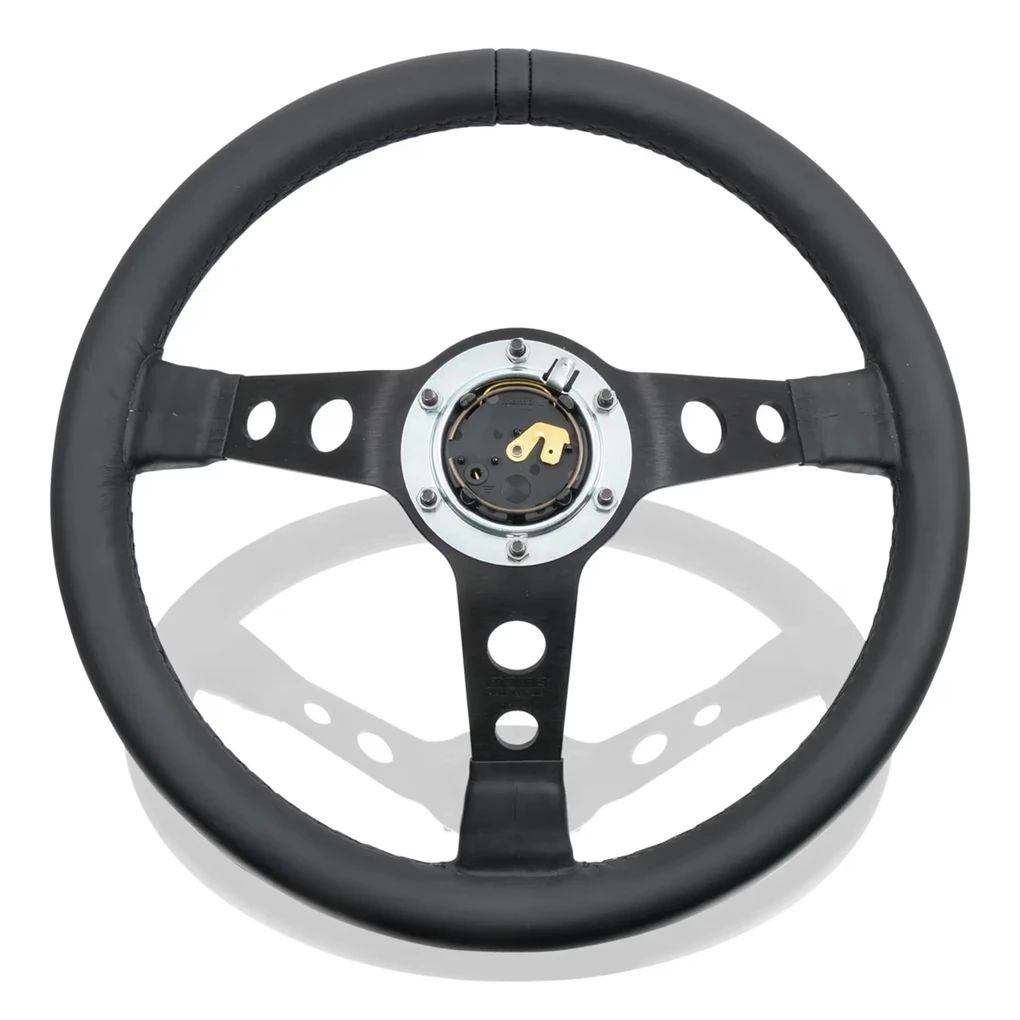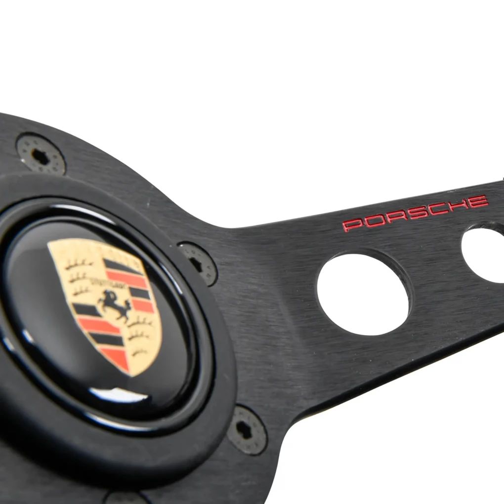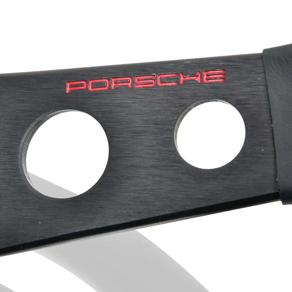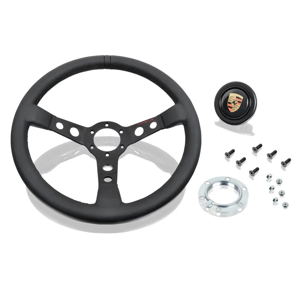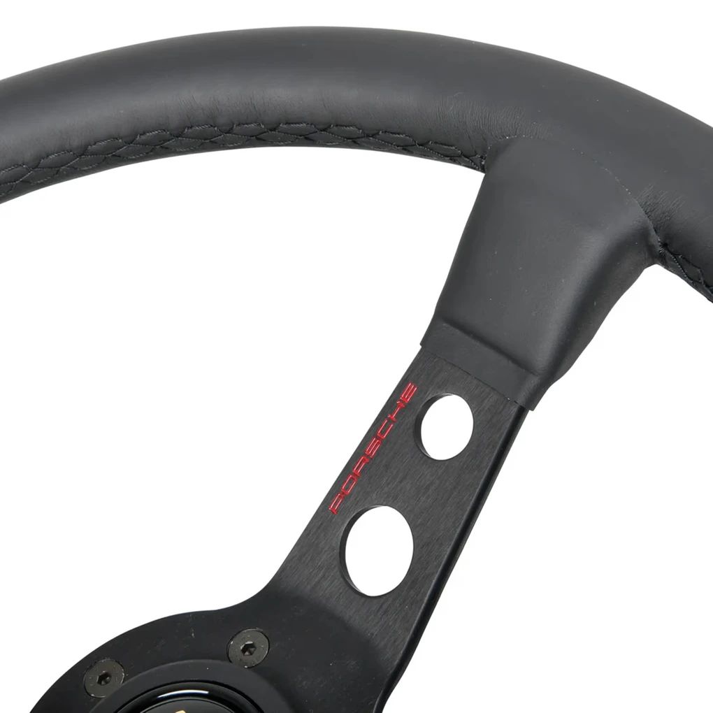 Das Porsche Classic Performance Lenkrad bringt die unverwechselbare Sportlichkeit von Porsche in Ihr Fahrzeug. Dieses hochwertige 3-Speichen Sportlenkrad wurde in Zusammenarbeit mit Momo entwickelt und besticht durch seine erstklassige Ergonomie und das zeitlose Design. Der Hupenknopf ziert das historische Porsche Wappen, während das schwarze Glattleder und der rot hinterlegte Porsche Schriftzug das ikonische Erscheinungsbild unterstreichen. Die schwarze Naht und die 12-Uhr-Markierung sind in dezentem schwarz gehalten. Mit einem Außendurchmesser von 35 cm (13,78 Zoll) bietet das Porsche Classic Performance Lenkrad optimale Kontrolle und Fahrspaß.