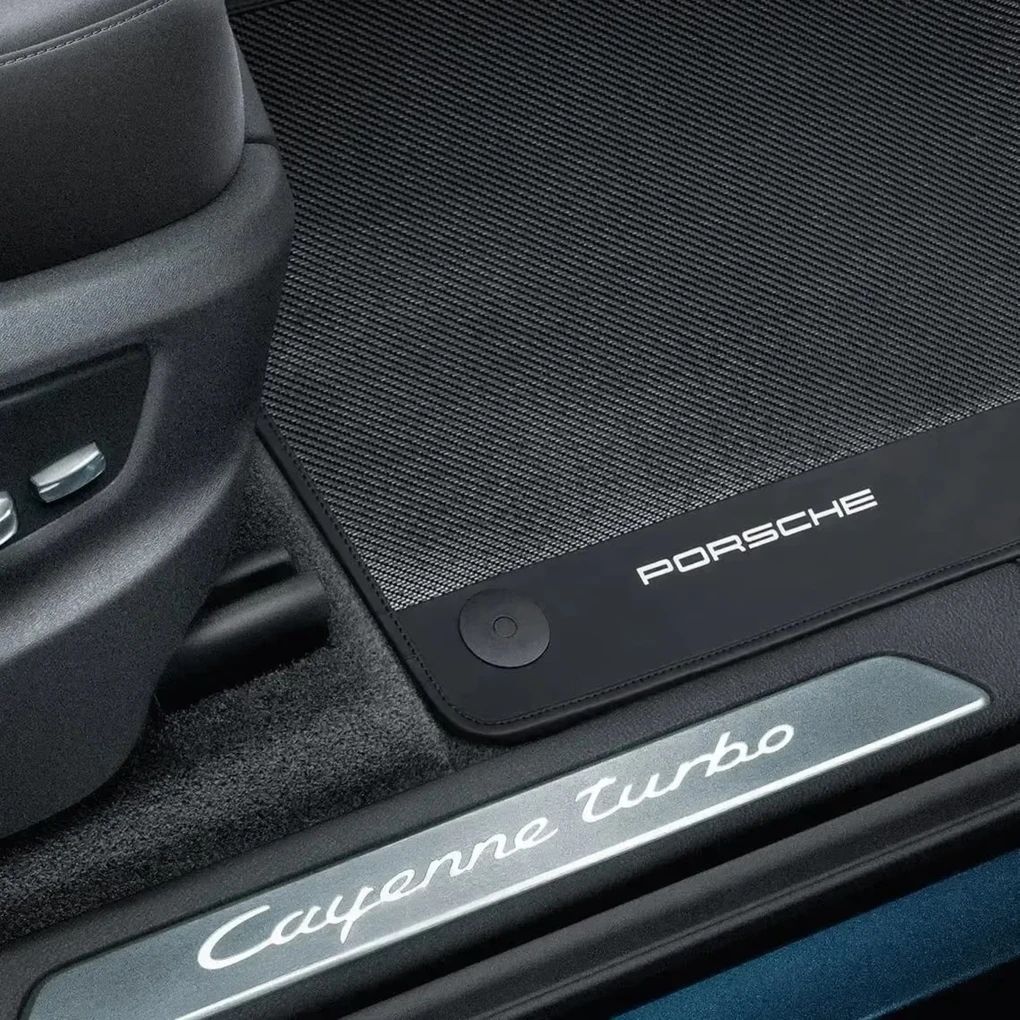 Vierteiliger Satz aus Echtcarbon mit Ledereinfassung und Naht in Schwarz. Inkl. Ledereinleger in Schwarz mit „PORSCHE“ Schriftzug.