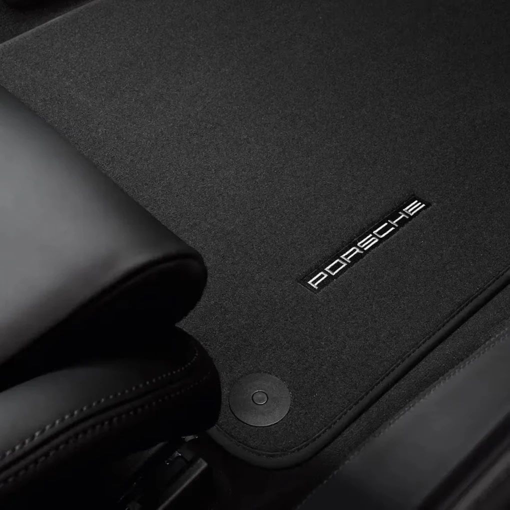 Zweiteiliger Satz, in ausgewählten Interieurfarben, mit Nubukeinfassung und Einleger mit eingesticktem, silbernen „PORSCHE“ Schriftzug.