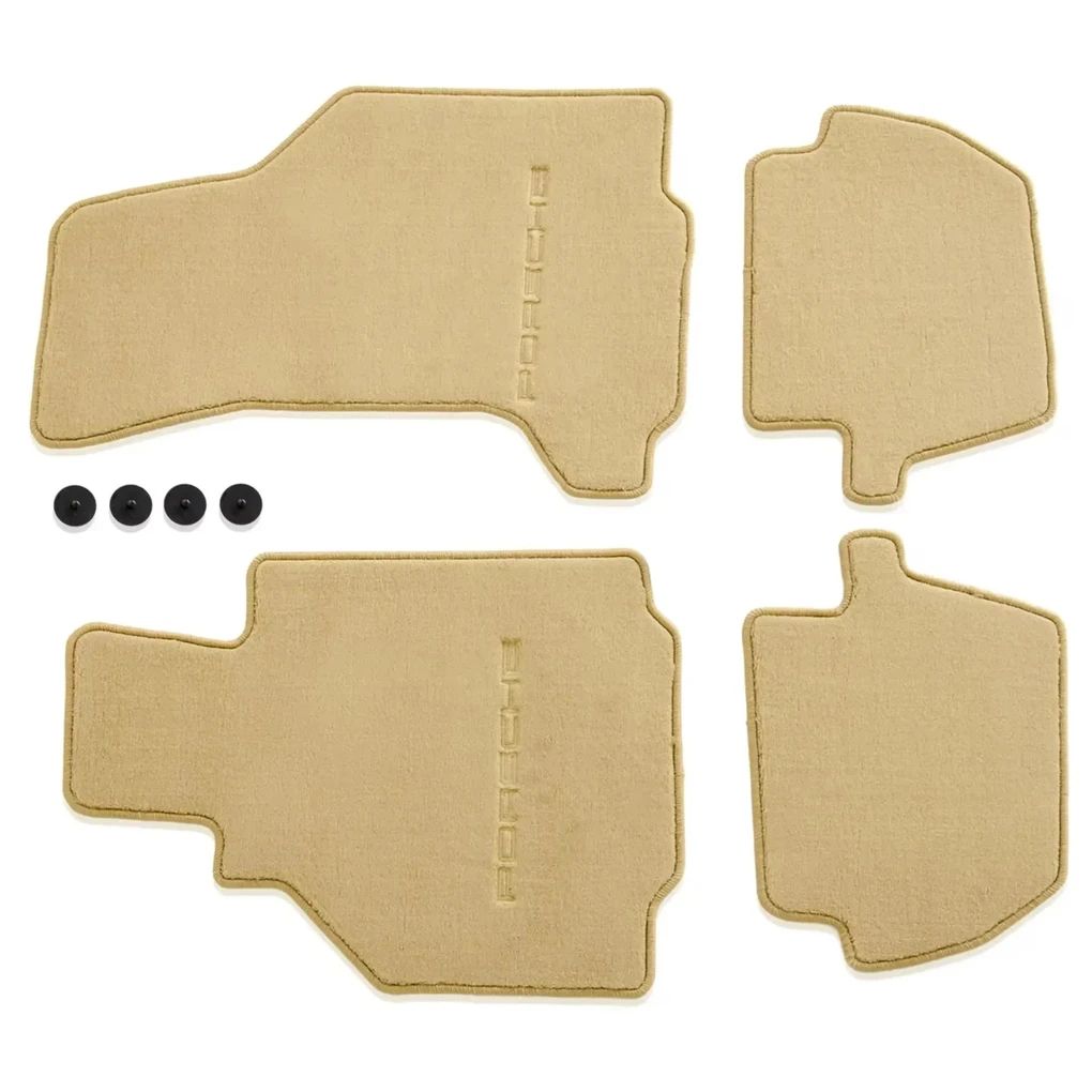 Fußmatten im Satz (4 Stück) in savannabeige für Linkslenker; verwendbar für Porsche 996 Cabrio und Targa der Baujahre 2002 bis 2005 - bis Modelljahr 01 (digitales Soundpaket) und ab Modelljahr 02 (Soundpaket Bose analog).